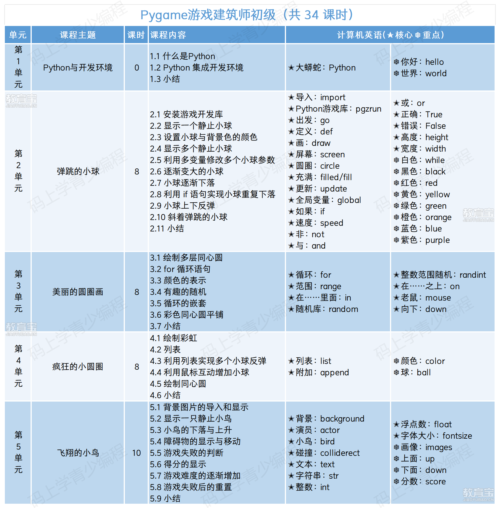 初级课程(34课时):涵盖Python基础到完整游戏开发,包含弹跳小球、飞翔的小鸟等5个单元,重点培养编程基础与英语术语。