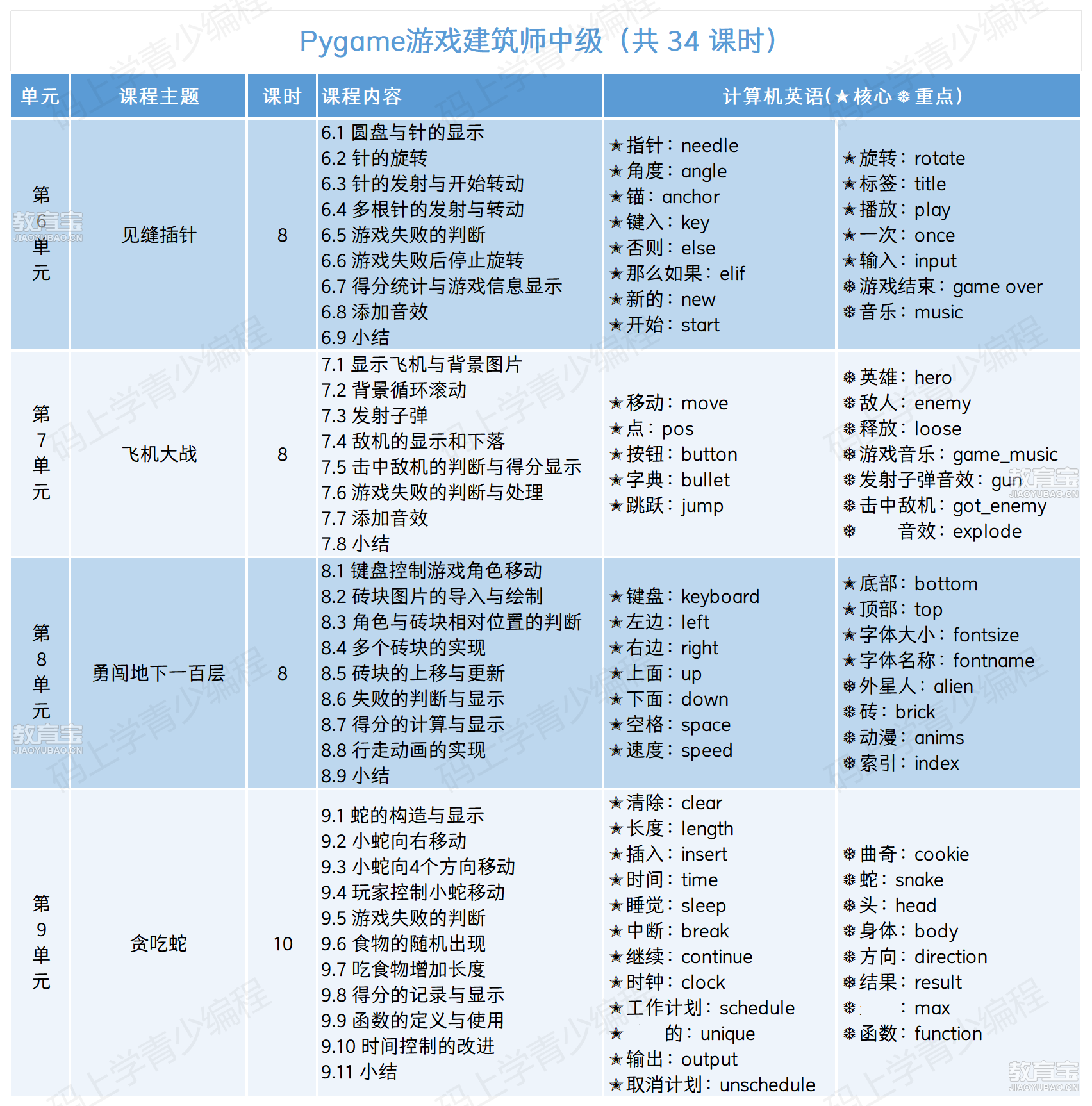 中级课程(34课时):深入游戏机制,包含见缝插针、飞机大战、贪吃蛇等4个经典游戏项目,强化面向对象编程能力。