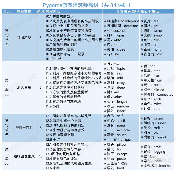 本课程分为初、中、高三个级别,共102课时,通过项目驱动方式系统学习Pygame游戏开发。
