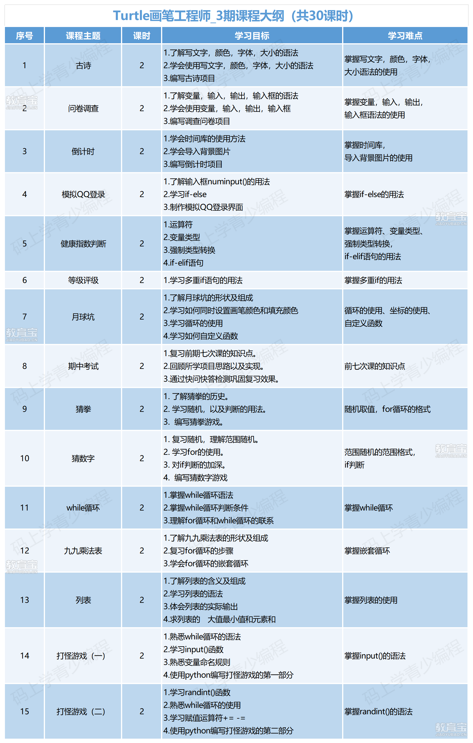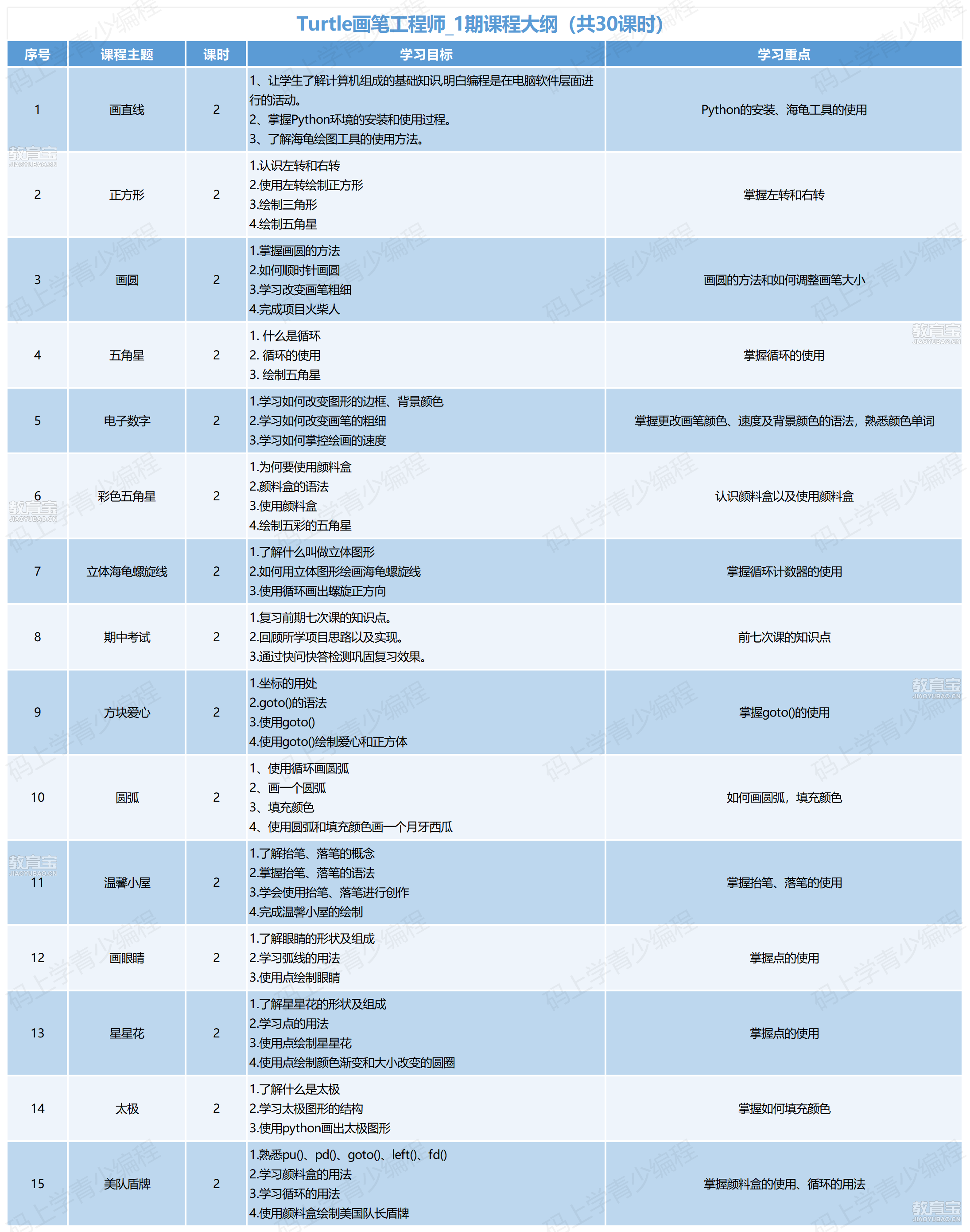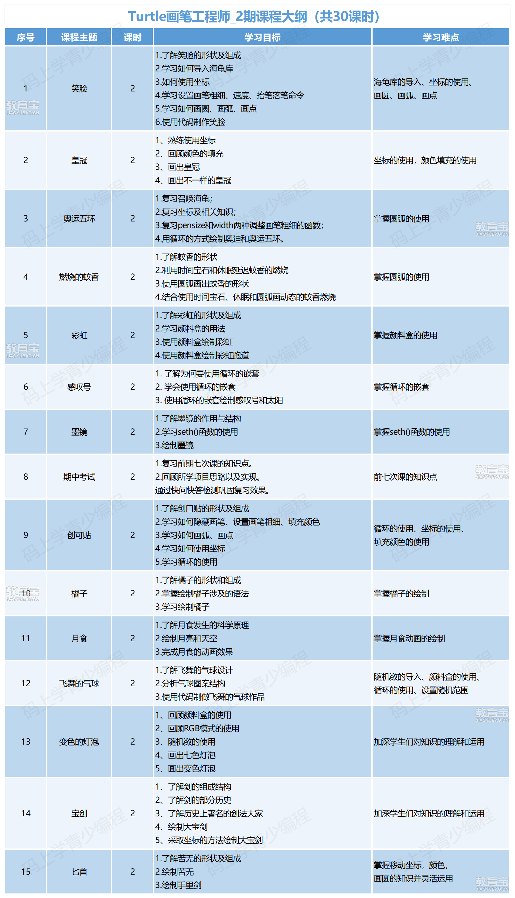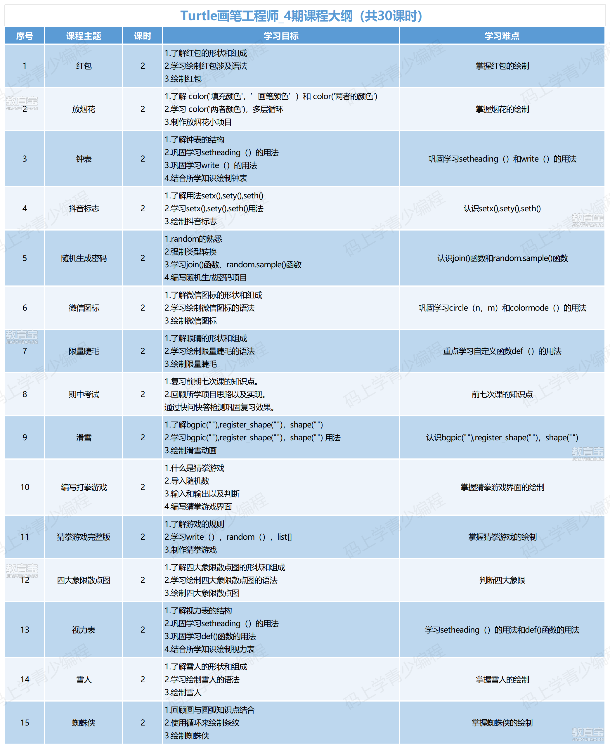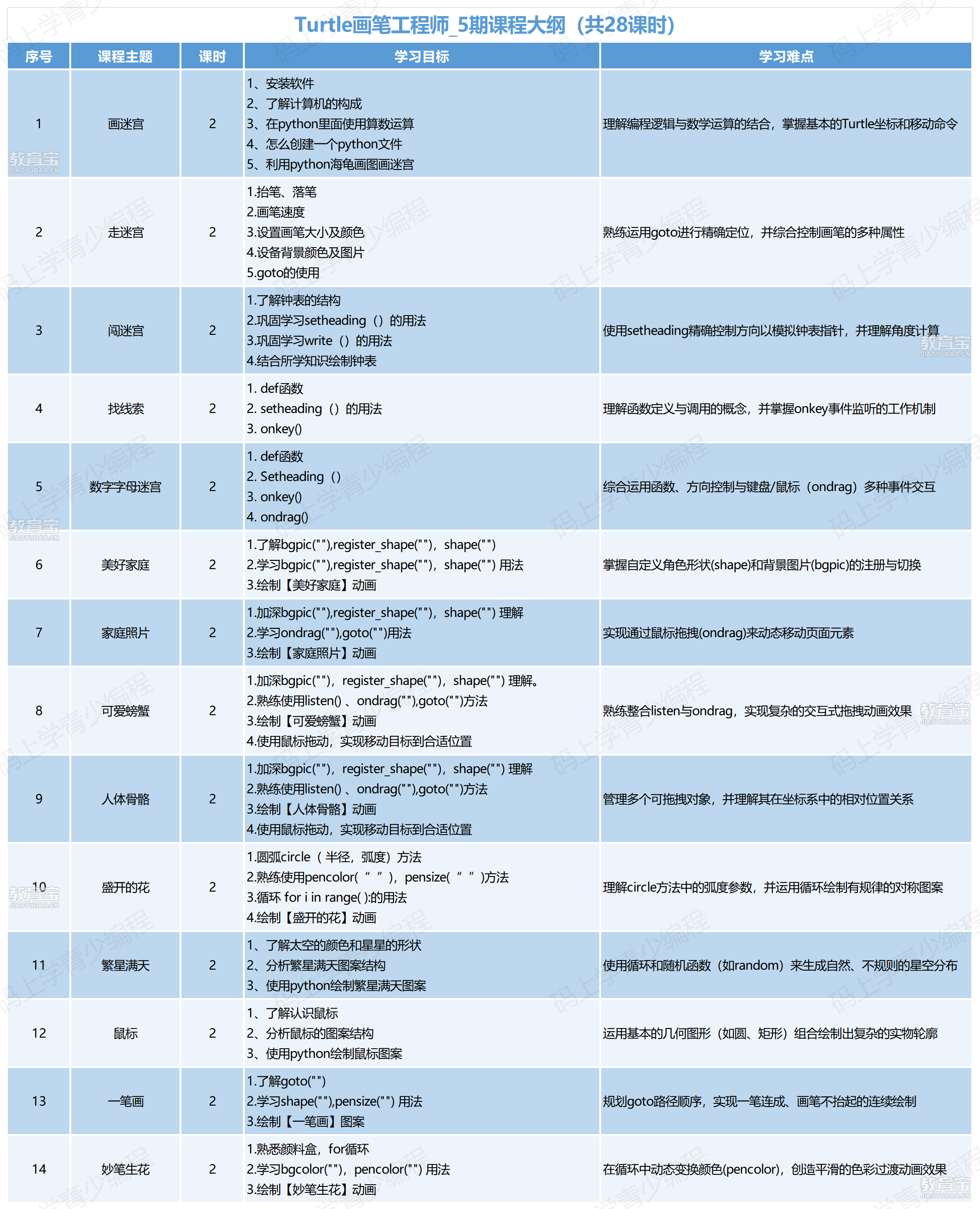 课程设计生动实用,每期均包含期中复习与期末创作,确保学员在绘制趣味图形的过程中,扎实掌握Python编程基础与计算思维。