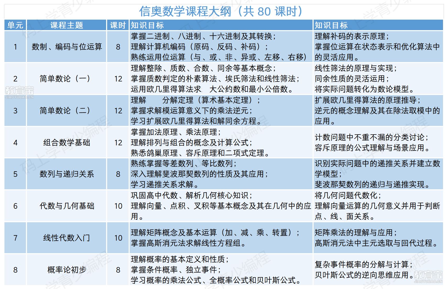 课程目标明确,注重将数学知识转化为解决实际算法问题的能力,为参加CSP-J/S、NOIP等竞赛奠定坚实的数理基础。