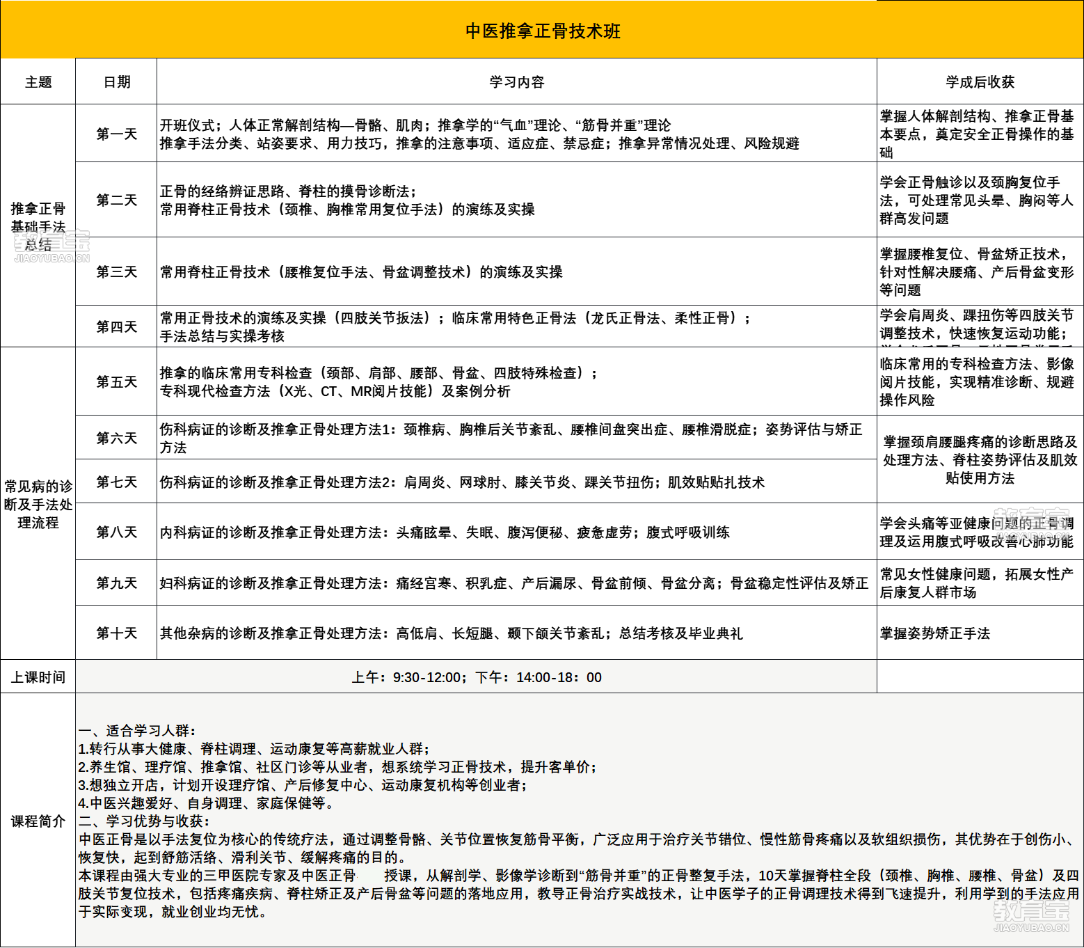 涵盖解剖学、影像学诊断到“筋骨并重”的正骨整复手法,掌握脊柱全段(颈椎、胸椎、腰椎、骨盆)及四肢关节复位技术,包括 疼痛疾病、脊柱矫正及产后骨盆等问题的落地应用,学习正骨治疗实战技术