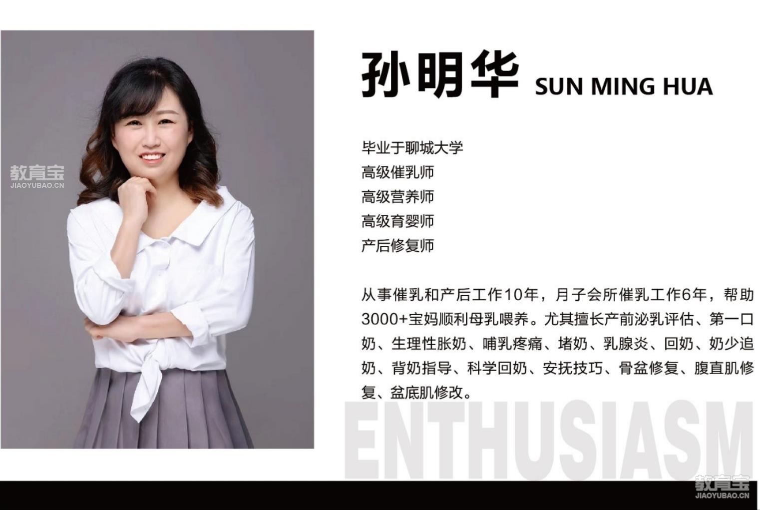 - 擅长: 产前泌乳评估、一口奶、生理性胀奶、哺乳疼痛、堵奶、乳腺炎、回奶、奶少追奶、背奶指导、科学回奶、安抚技巧、骨盆修复、腹直肌修复、盆底肌修改