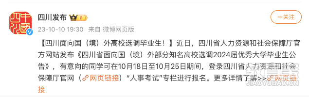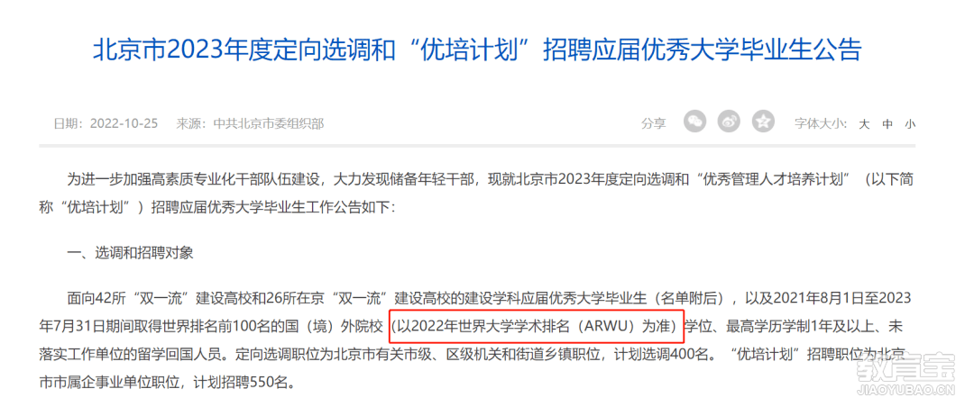 截图自微博 而此前, 北京则向2023年软科世界大学学术排名榜单前100名院校的留学生,开放了申请2024年度北京定向选调的资格。