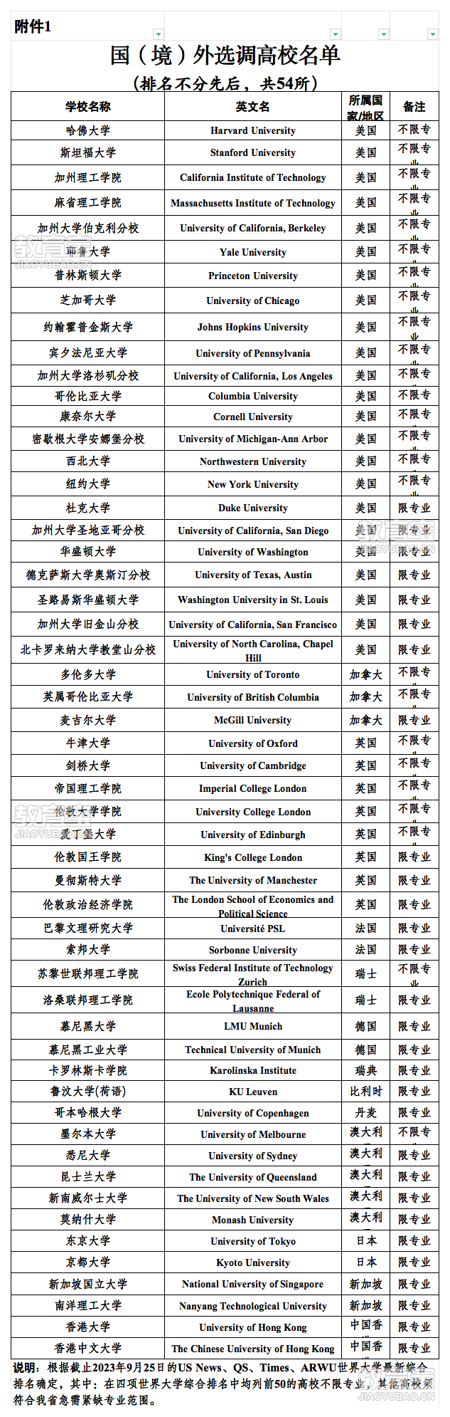02 不过,向归国留学生开放定向选调,其中也存在一些争论。 比如入围学校的层次。 目前,对于海外院校如何划定层次,各省标准不一。 在 很明显,这些学校,申请难度完全不一样。 在 不同的国家上学,学习生活成本 也相差很多。 2024年北京面向海外院校定向选调所划定的院校范围,是 软科世界大学学术排名榜前100名。 软科世界大学排名由上海交通大学世界大学研究中心发布,侧重衡量高校的研究实力,重视论文和尖端科技,几乎所有指标都是量化的,没有评估因素。 因此,在这份排名上,理工类学校更占优势。 2023年,山西面向69所海外院校招聘的选调生,主要岗位面向省、市直机关。 在该次招录圈定的学校范围中,包括哈佛大学、耶鲁大学、剑桥大学等世界知名院校,也包括英国格拉斯哥大学,澳大利亚新南威尔士大学、昆士兰大学、莫纳什大学等拥有众多中国留学生的院校。 那么,在对归国留学生的定向选调招录中,划定学校范围的标准是什么呢? 不少网友认为,可能是参考了目前主流的四个世界院校排名。 国际主流的世界院校排行榜包括: 泰晤士世界大学排行榜 (Times Higher Education World University Rankings)、 美国新闻世界大学排行榜 ( U.S. News Best Colleges)、 QS世界大学排行榜 (QS World University Rankings)和 软科世界大学学术排名 。 在四个榜单上,各大院校排名相差很多,甚至不少顶级学校,在不同的榜单上位次也有明显不同,如果依据榜单划定学校范围,很难统一标准。