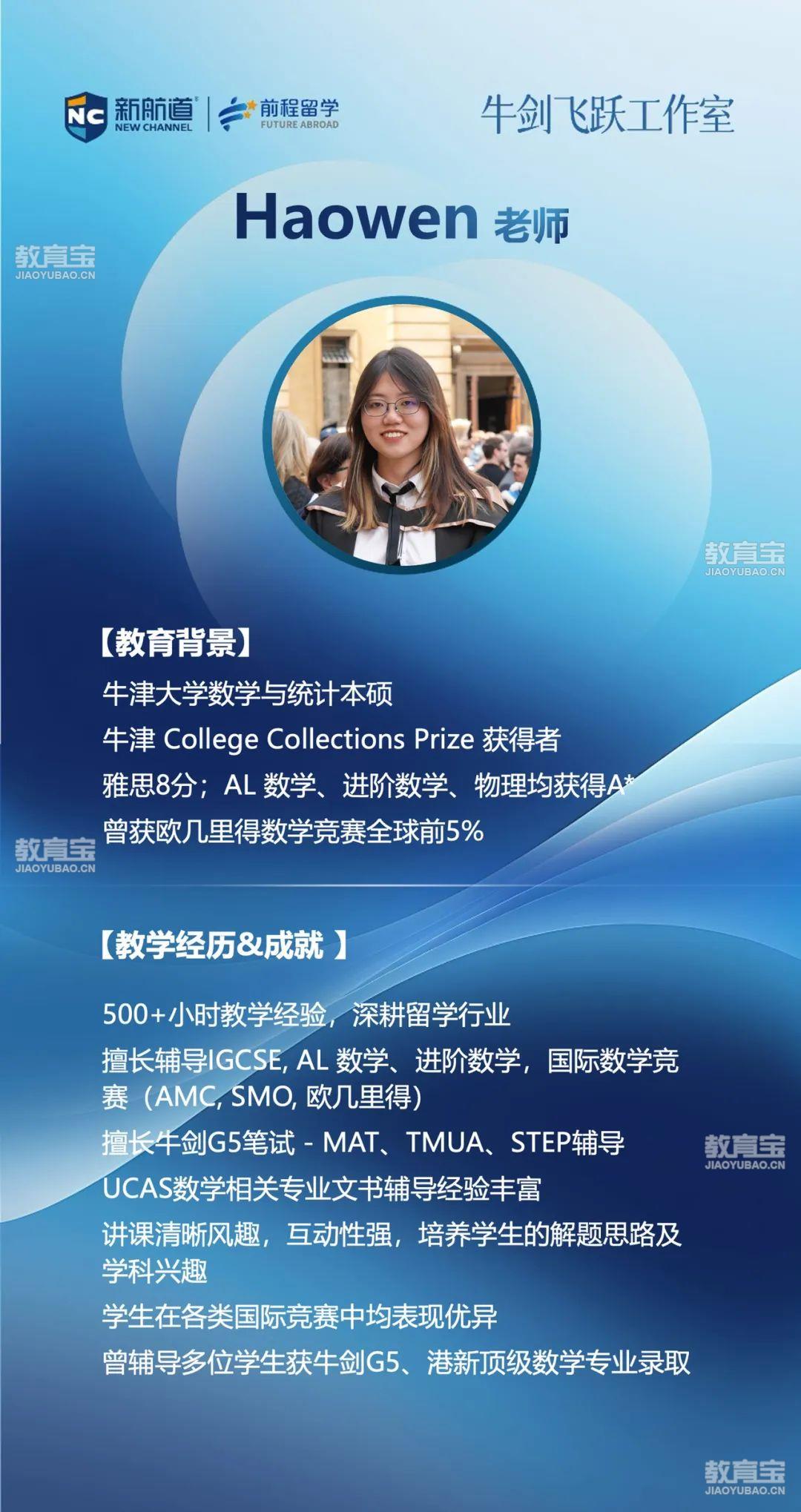 解答题的评分标准则根据详细的解题步骤来确定,即使得到正确答案也不一定能够获得满分,而相反,即使没有得到正确答案,只要解题过程正确、完整和规范,也可能获得该题大部分分数。03欧几里得竞赛时间1.比赛时间:北美地区:2025年4月3日非北美地区:2025年4月3日2.报名截止时间:2025年3月6日计划参加2025年4月欧几里得竞赛的同学们来说,一定要抓紧好寒假这个时间,提前做好备赛准备。新航道牛剑飞跃工作室欧赛竞赛师资介绍(部分)??????