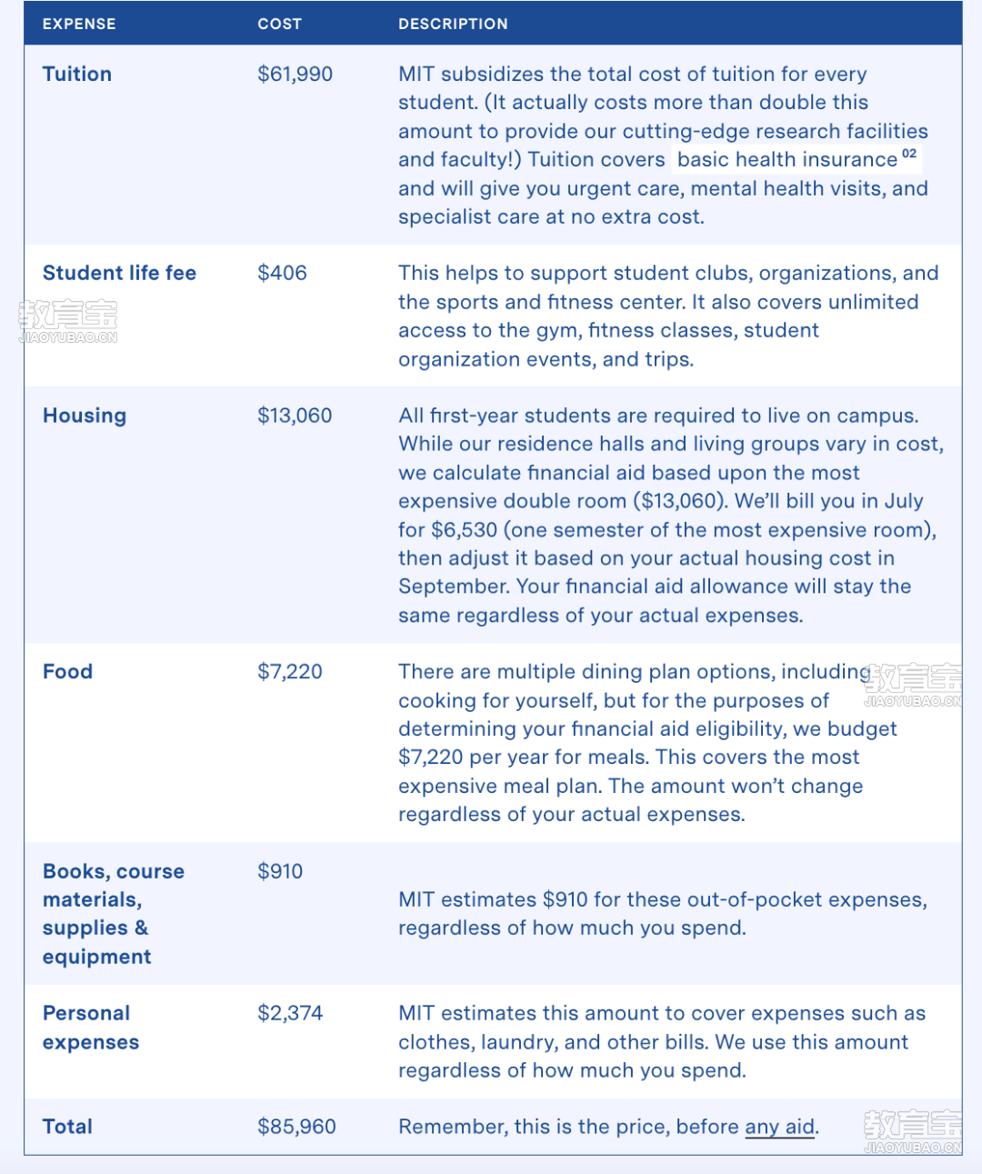 学校会先对学生的学术*、个人才能、课外活动、推荐信等非经济因素进行评估,来决定是否录取该学生。一旦学生被录取,学校会根据学生家庭的经济情况,通过助学金、奖学金、贷款和校内工作机会等多种方式,来确保学生能够负担得起学费和生活费用。例如,像安默斯特学院和鲍登学院这样实行 “Need - Blind” 招生政策的学校,在录取过程中,一个来自低收入家庭的学生和一个来自富裕家庭的学生,只要他们在学术、个人素质等方面达到学校的录取标准,就都有相同的机会被录取。需注意的是:Need-Blind并不等同于“满足全部需求”。有些学校可能在录取时无视支付能力,但在提供经济资助时,却无法满足学生在校期间的所有合理需求。一、MIT免学费政策详情细看MIT的政策,这次免除学费分为四类:· 家庭收入低于10万美元:免除所有与就读相关的费用,包括学费、住宿费、膳食费、杂费、书本费等!这个门槛比2024学年的7.5万美元更为放宽。· 家庭收入低于20万美元:免除学费。· 家庭收入介于10-20万美元:家长支付金额按递增比例计算,*高不超过23,970美元。· 家庭收入高于20万美元:可根据具体财务状况申请基于需求的财政援助。根据MIT官网信息显示,2024-25学年学费加各种学杂费预计85,960美元,相当于62万人民币,4年下来直接省了248万人民币!