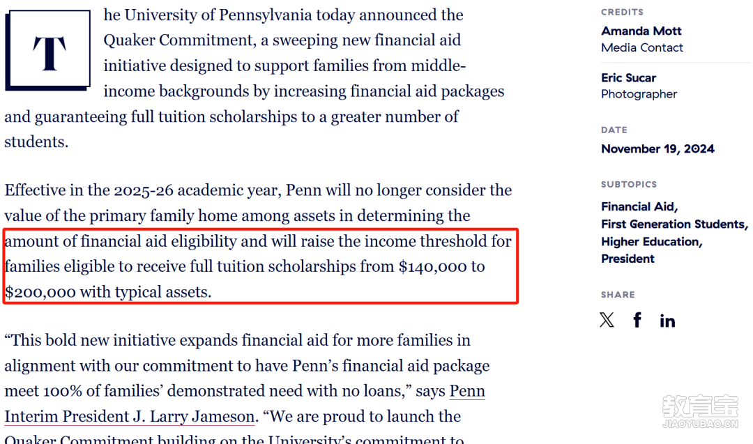 宾大启动了 “Quaker Commitment” 经济援助项目,从2025-2026学年开始,将获得免学费资格的家庭年收入门槛从14万美元提高到20万美元。这一提升使更多中产阶级家庭的学生有机会享受学费减免。在评估学生援助资格时,宾大将不再把家庭的房屋净值作为资产考虑。这一重大变化对于拥有房产但经济相对紧张的家庭来说是一大利好,大大提高了他们获得经济援助的可能性。