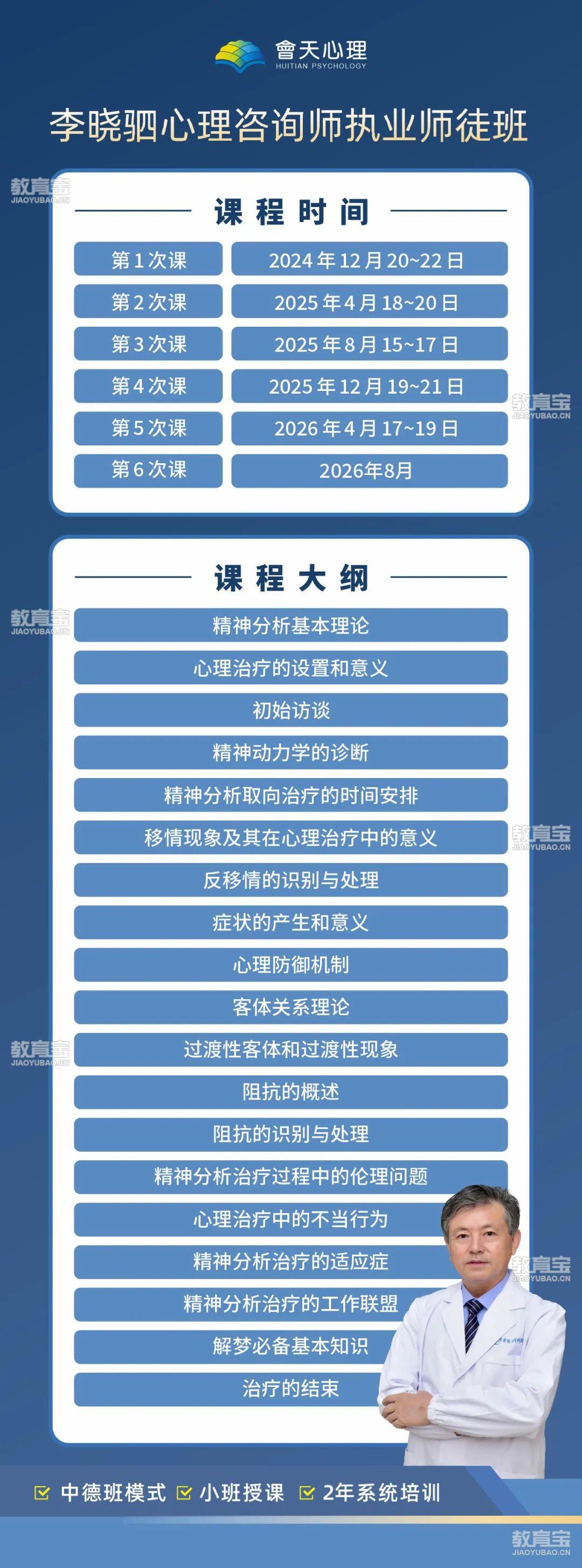 注:根据教学实际情况,内容会略有调整。 如果你是 精神科医生或其他医务人员 你会接触到不同成长背景的心理咨询师,通过思维碰撞与交流,你会收获更多多维度的观点与认知,提升专业能力! 如果你是 初入行的新手咨询师 成为李晓驷老师的弟子,将极大加快你的成长速度,系统化提升心理咨询技能,将个案做得持久且有效,帮助更多人走出心理困境! 如果你是 心理学或心理咨询专业学生 将系统化的学习心理咨询技能,大量节省学习的时间、精力与成本,找到快为一名合格心理咨询师的捷径!🌱【退换课及*政策】为保障双方权益,报名会天心理任一课程与服务时,请仔细阅读以下条款,付款报名后,即默认同意。1、学费一经缴纳,不接受任何原因*,不可延期,可在开课前自行转让;2、开课后,一律不*、不换课、不转让、不延期;3、课程主办方保留特殊情况下调整课程时间的权利。4、课程不得以任何原因加价转让。再说一遍!李晓驷心理咨询师执业师徒班 2年只开1期 转发此文章至朋友圈集赞可抵扣学费哦 50赞抵50元,100赞抵100元全程由李晓驷老师亲自手把手教学当期优惠请咨询工作人员