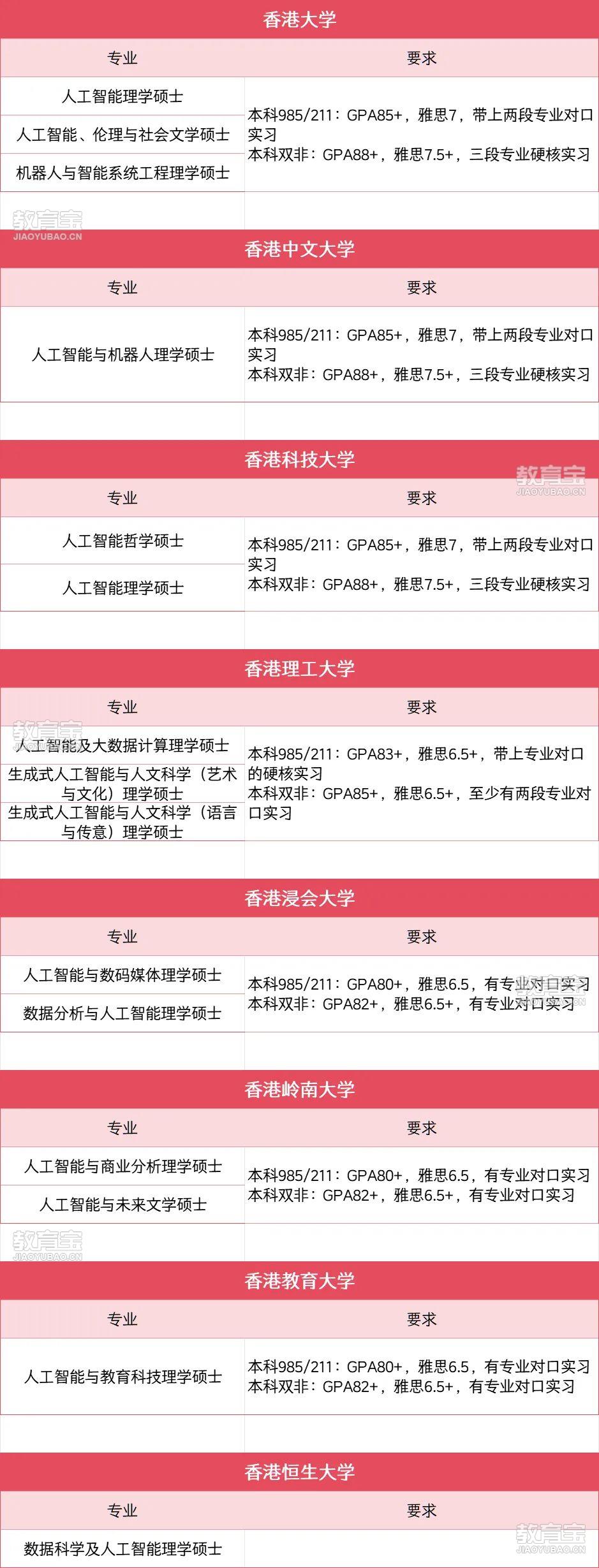 香港理工大学人工智能及大数据计算项目?项目介绍:港理工的人工智能及大数据计算是23fal开设在工程学院下的项目。课程设置上比较像CS和DS的结合,也算是港理工IT的平替项目。? 学制:1年? 学费:358000港币/年? 申请要求?绩点:偏好录取92的学生,绩点大多数在80-85分之间,双非需要比较高的绩点?专业:*好是理工科专业背景?工作党会有一定的加分此外,香港的其他高校也纷纷开设了与 AI 相关的专业以下是专业汇总