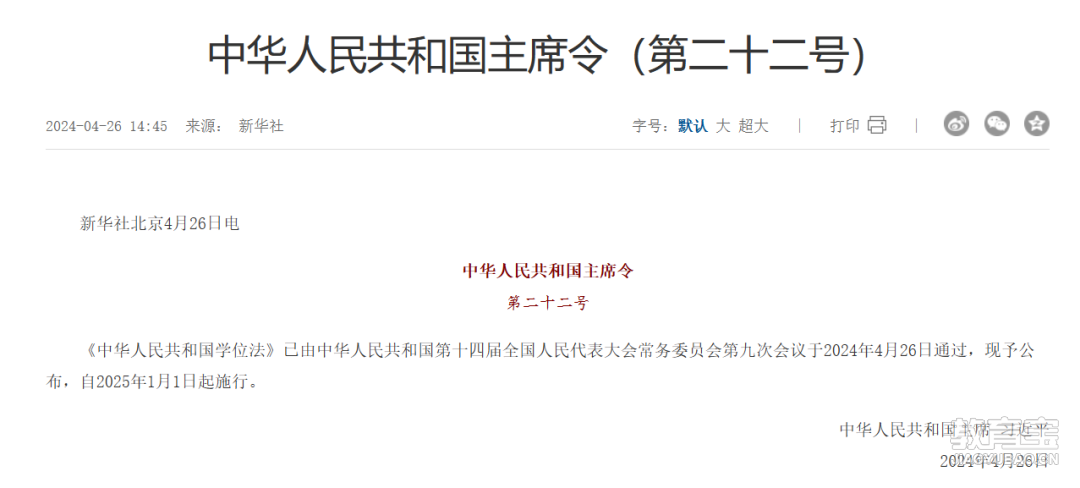 (图源:中国ZF网)这次《学位法》的发布,有哪些需要关注的地方?对于我们考研、读研又有哪些影响?本期就跟着海盐姐/文文一起来看看吧!一、专硕学硕,法律面前一律平等《学位法》是我国第一部规范学位制度的法律文件,明确规定了我国实行“三级两类”的学位体系。这个体系最显著的特点是将学位分为学术学位和专业学位两类;在法律上,这两种学位具有同等地位和重要性。有了法律的支持,用人单位不能再随意歧视。《学位法》正式生效,为实践导向的人才培养提供了保障;现在,专业学位和学术学位处于同等地位。随着政策的推动,学硕招生比例从2013年的近60%下降到不足40%,而专硕招生人数在2017年超过学硕,如今已占六成以上,成为研究生教育的主体,标志着人才培养结构发生了历史性变化。