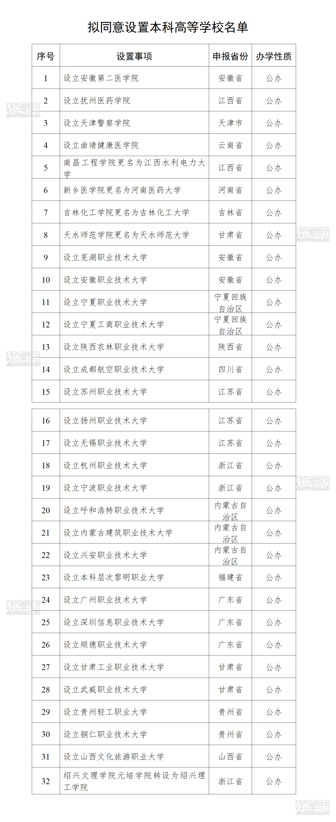 从教育部官网获悉,根据《中华人民共和国高等教育法》《普通高等学校设置暂行条例》《普通本科学校设置暂行规定》《本科层次职业学校设置标准(试行)》等有关规定以及第八届全国高等学校设置评议委员会考察评议结果,经教育部党组会议审议,拟同意设置安徽第二医学院等32所学校,现予公示。