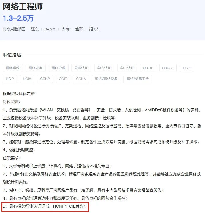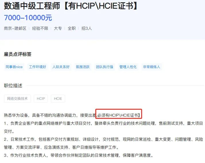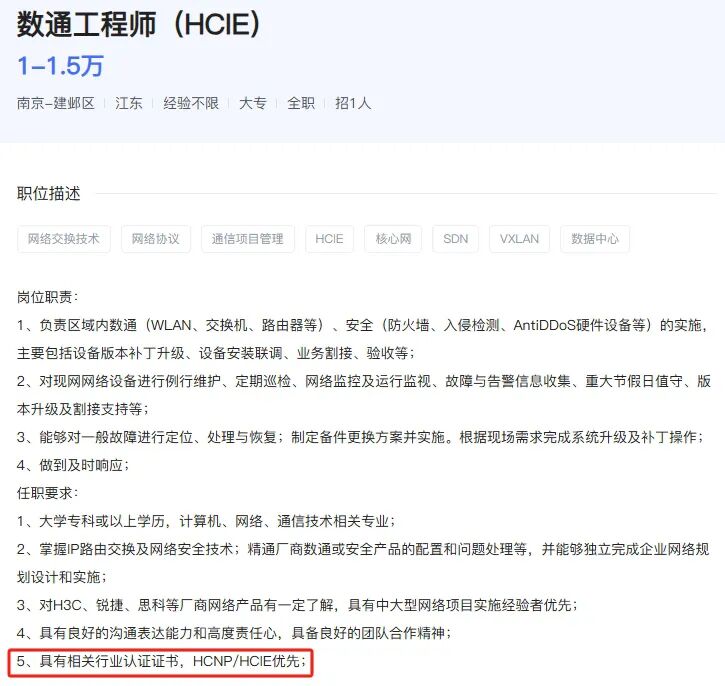 (实操机架)此外,课程还采用了科学的教学方法和进度安排,根据学员的学习情况进行针对性辅导。定期组织模拟考试,帮助学员熟悉考试流程和题型,及时发现自身的薄弱环节并进行强化训练,为顺利通过HCIE认证做好充分准备。认证加持,职业发展迎来新机遇HCIE认证的价值早已得到行业的广泛认可。持有HCIE证书,不仅意味着学员具备了扎实的技术功底和解决复杂问题的能力,更能为他们的职业发展带来诸多好处。从招聘市场来看,各大企业对HCIE持证者的需求旺盛,网络架构师、云计算工程师等高薪岗位往往将HCIE认证作为重要的招聘条件,持证者的薪资待遇也比无证者高出 15% - 20%。