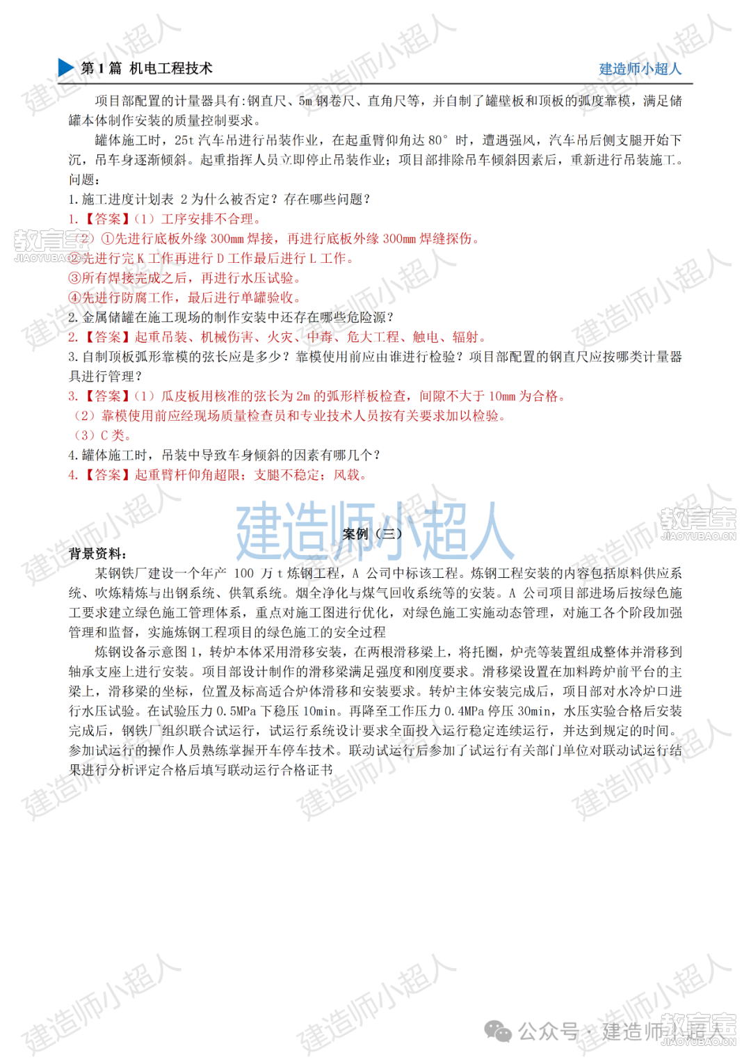 遵循2024年《一建》的命题趋势:1、考了绿色施工2、考了冶炼设备:一建考轧机,二建考转炉3、考了石油化工设备:一建考塔器,二建考储罐4、考了电气,且教材上都没有原话案例题中,有15分左右的考点来自施工规范:1、GB 50403-2017《炼钢机械设备工程安装验收规范》2、GB 50149-2010...