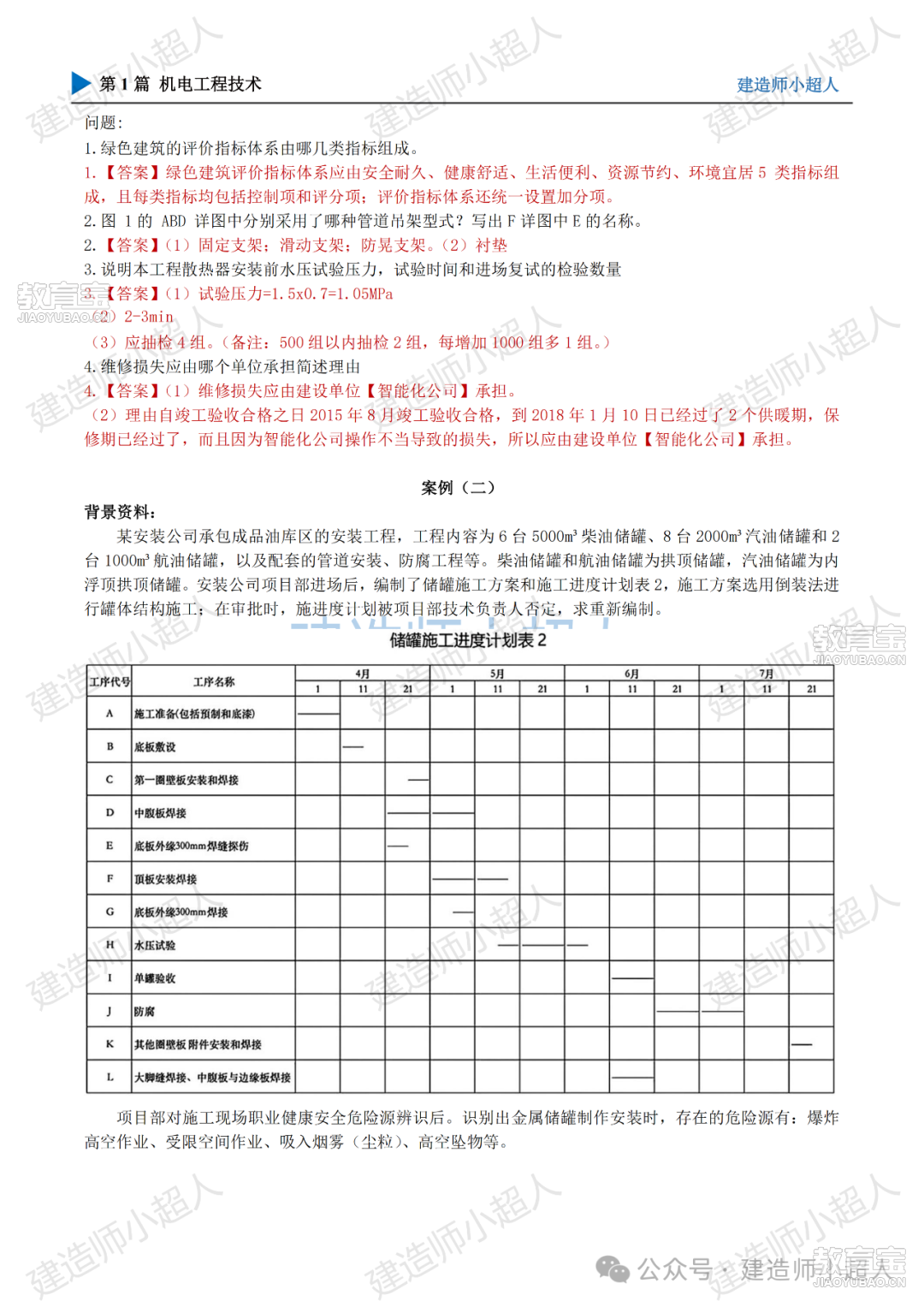遵循2024年《一建》的命题趋势:1、考了绿色施工2、考了冶炼设备:一建考轧机,二建考转炉3、考了石油化工设备:一建考塔器,二建考储罐4、考了电气,且教材上都没有原话案例题中,有15分左右的考点来自施工规范:1、GB 50403-2017《炼钢机械设备工程安装验收规范》2、GB 50149-2010《电气装置安装工程母线装置施工及验收规范》3、GB 50411-2019《建筑节能工程施工质量验收标准》关于估分:1、不必过分悲观,可以宽松一点2、关于案例题各个小问的分值,根据经验进行分布,供大家参考3、估分60+应该都有希望(60%合格线的考区)4、金属储罐的横道图为考生回忆版,与真题考卷可能存在差异,且一二建关于此考点存在矛盾,大家不要过分纠结5、不要过分解读二建的考题,咱们考一建的道友按照自己的节奏复习,二建考过的知识点加个标记,多关注二建真题附近的平行知识点