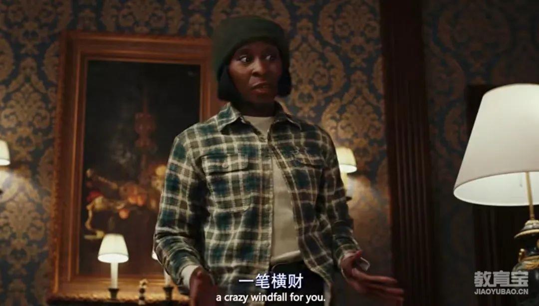 这句台词里,想独吞财产的女儿询问对方职业时,她的姐妹回答了这句话,on the side。这个短语表示“除了本职工作,还可以赚钱的副业”。例句:no one lived in the property, but the caretaker made a little on the side by letting rooms out"该房产无人居住,但管理员通过出租房间赚取了一些额外收入。“on the side” 在非正式英语中还可以表示恋爱关系中的第三者或婚外情/秘密恋情,尤其是指在已有伴侣的情况下,偷偷进行的额外恋情或性关系。例句:He"s married, but I think he has someone on the side.他已婚,但我觉得他在外面有别的人。另外,在餐饮行业,on the side可以表示作为附带的东西。常用于沙拉酱、酱汁或其他调味料等。例句:Can I have some fries on the side?可以给我来点薯条配菜吗?in the biz