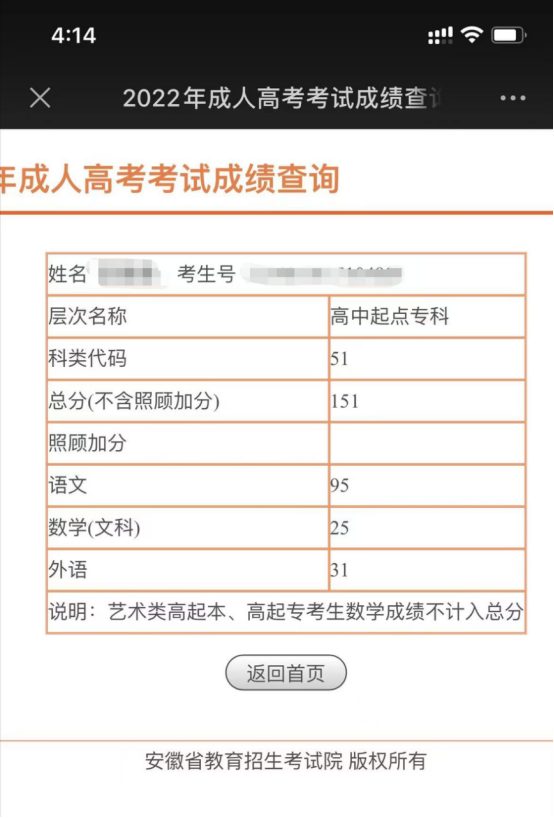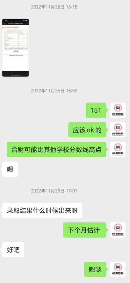 考试结束后,我们就一起静静等待考试结果。2022年高起专理工类的分数线是127分。11月底可以查询成考分数了,邵……,超出分数线24分。