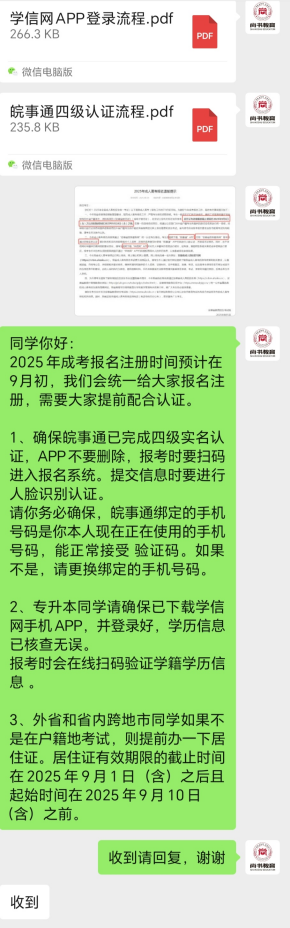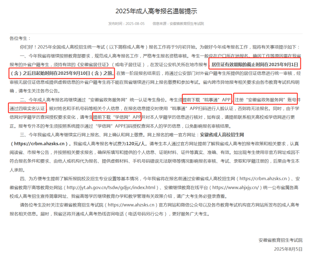 注:今年8月份安徽省考试院也发布了关于成考报名的温馨小提示,比如提前下载皖事通APP,注册账号并完成四级认证,下载学信网APP及异地考试需要办理居住证等注意事项,我们都会及时通知到同学们,协助他们做好报名前的准备。