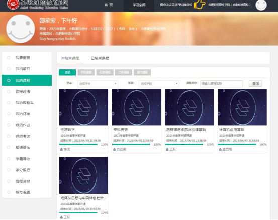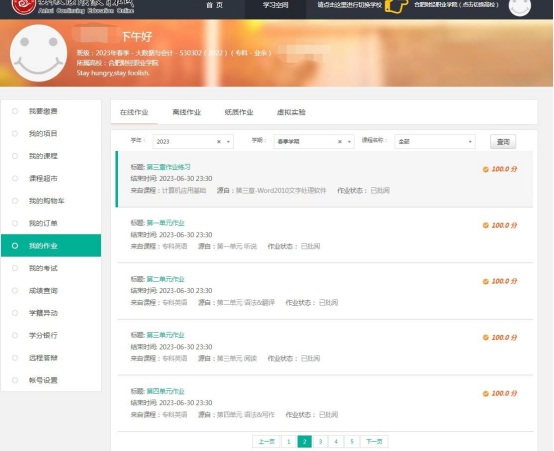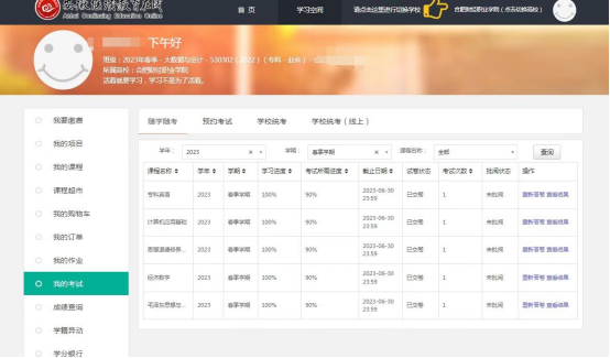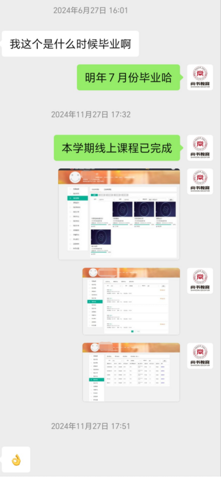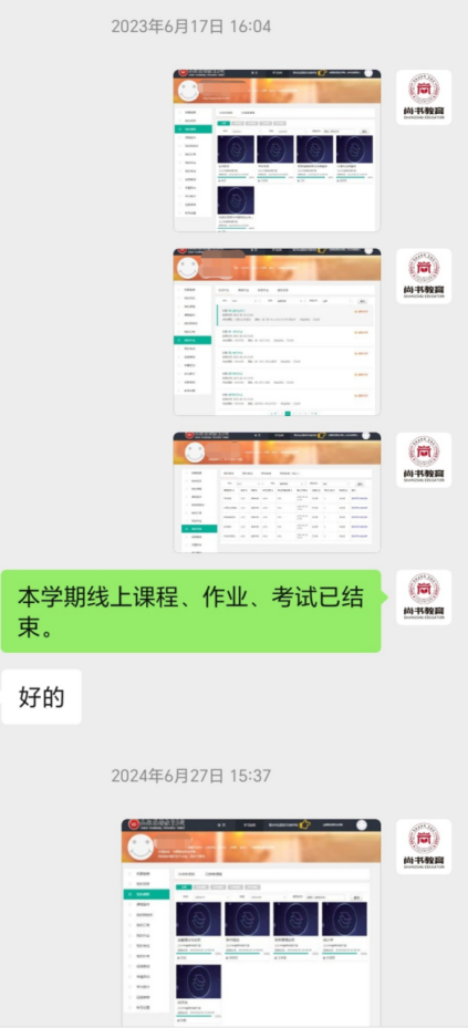 同时,线上教务托管也同步开启啦。每学期我都会及时地将线上教务(包括课程、作业及考试等)的完成情况反馈给邵同学,让邵同学工作之余无后顾之忧,惬意享受生活。