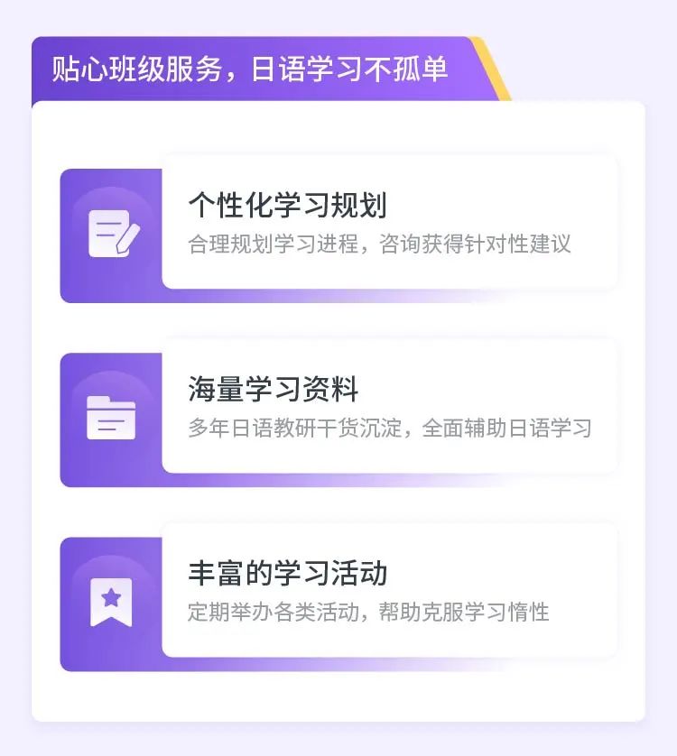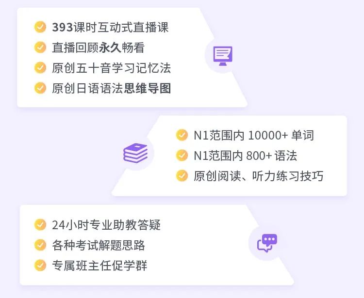 ? 407课时互动式直播课? 直播回顾畅看? 原创五十音学习记忆法? 原创日语语法思维导图? N1范围内10000+单词? N1范围内800+语法? 原创阅读、听力练习技巧? 24小时专业助教答疑? 专属班主任促学群