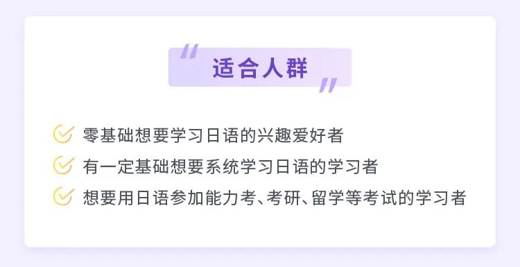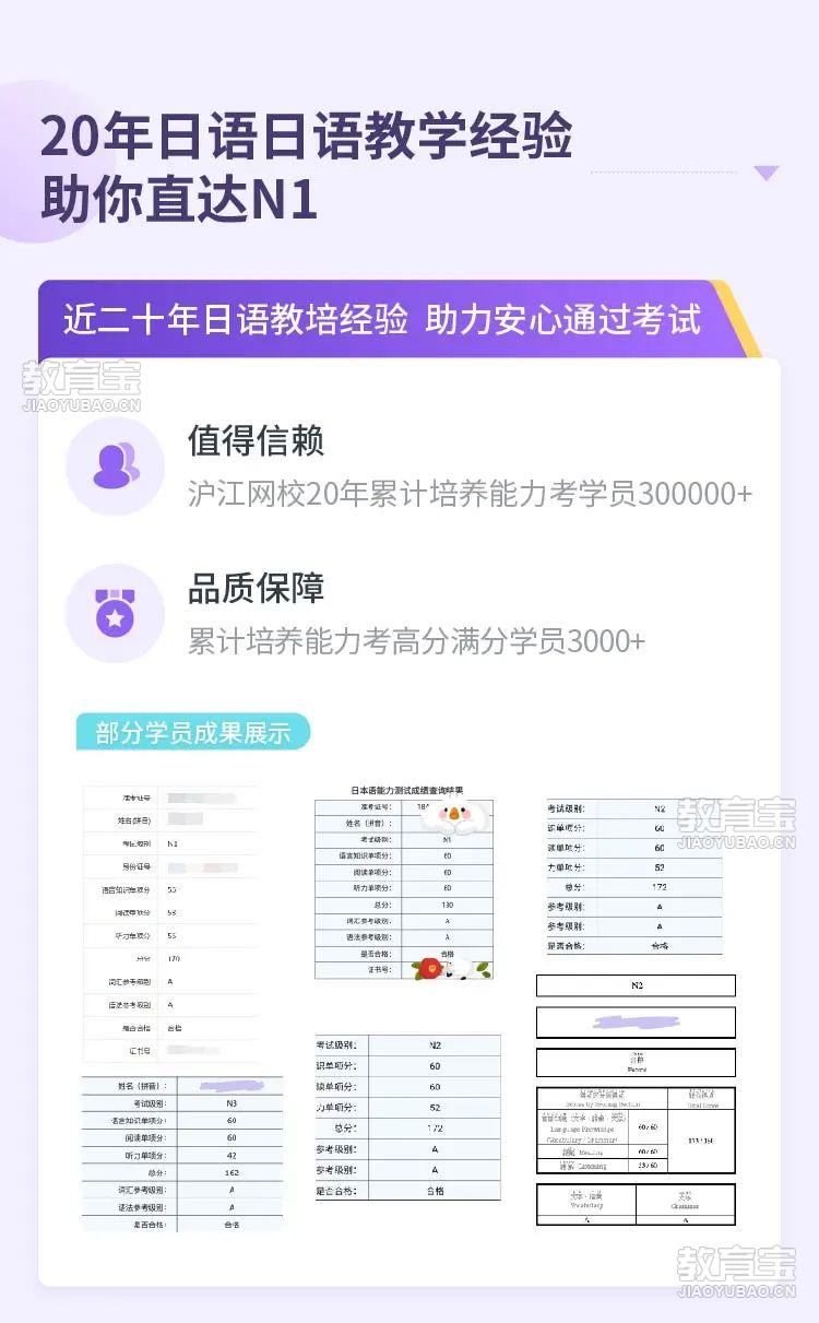 0-N1/N2/N3/N4/N5直播课本系列课程由沪江日语教研团队精心打造,采用新标日教材(沪江为新标日官方正版合作伙伴),专家级先生亲自直播授课,一经上线就卖到爆款。现在购买,享受新春启新好价!沪江日语深耕日语教育行业21年,共培养3万考生通过能力考,其中更有3000+名满分学员!2024年12月我们再次刷新鸭题记录,共鸭重352个考点!只要你想零基础入门一路考取能力考证书,就来沪江学吧!日语0-N全程直播课1节课仅需1杯奶茶钱