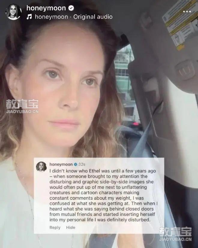 Lana commented on Pop Base’s Instagram post about the clip, writing, “I didn’t know who Ethel was until a few years ago – when someone brought to my attention the disturbing and graphic side-by-side images she would often put up of me next to unflattering creatures and cartoon characters making constant comments about my weight, I was confused at what she was getting at. Then when I heard what she was saying behind closed doors from mutual friends and started inserting herself into my personal life I was definitely disturbed.”打雷姐在 Pop Base 关于这段歌曲的Instagram 帖子下评论道:“几年前我才知道伊瑟尔·凯恩是谁——有人提醒我,她经常把我的照片与一些不讨喜的生物和卡通角色并排放在一起,并不断评论我的体重,这让我很困惑,不明白她想表达什么。后来,通过共同的朋友,我听到了她在私下里说的那些话,还开始干涉我的个人生活,这让我感到非常不安。”