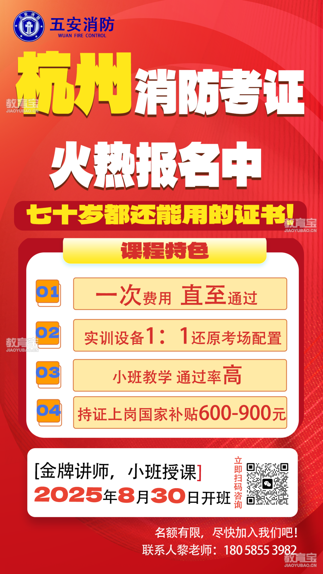 在职业资格频繁更新的时代,消防设施操作员证却以终身有效性成为稀缺资源! 2025年8月30日五安消防杭州班正式开课现开放最后名额,持证即享国家补贴,早考早受益!