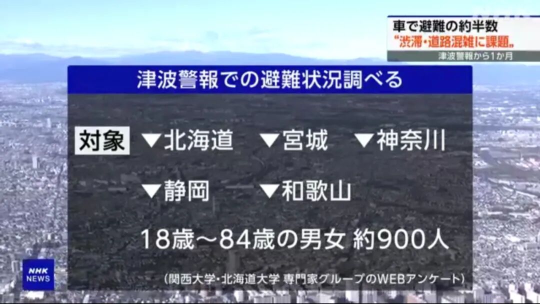 先月30日、ロシアのカムチャツカ半島東方沖で起きたマグニチュード8.8の巨大地震では、北海道から和歌山県にかけての太平洋沿岸に津波警報が発表され、車で避難する人で道路が渋滞したところもありました。上个月30日,俄罗斯堪察加半岛东部近海发生8.8级巨大地震,从北海道到和歌山县的太平洋沿岸发布了海啸警报,有些地方道路因开车避难而堵塞。関西大学と北海道大学の専門家で作るグループは、避難の状況を調べるため、今月、WEBアンケートを行いました。由关西大学和北海道大学的专家组成的小组,为了调查避难情况,本月进行了WEB问卷调查。対象は警報が発表された北海道、宮城県、神奈川県、静岡県、和歌山県に暮らす18歳から84歳までの男女、あわせておよそ900人。对象为在发布警报的北海道、宫城县、神奈川县、静冈县、和歌山县生活的18岁到84岁的男女,合计约900人。