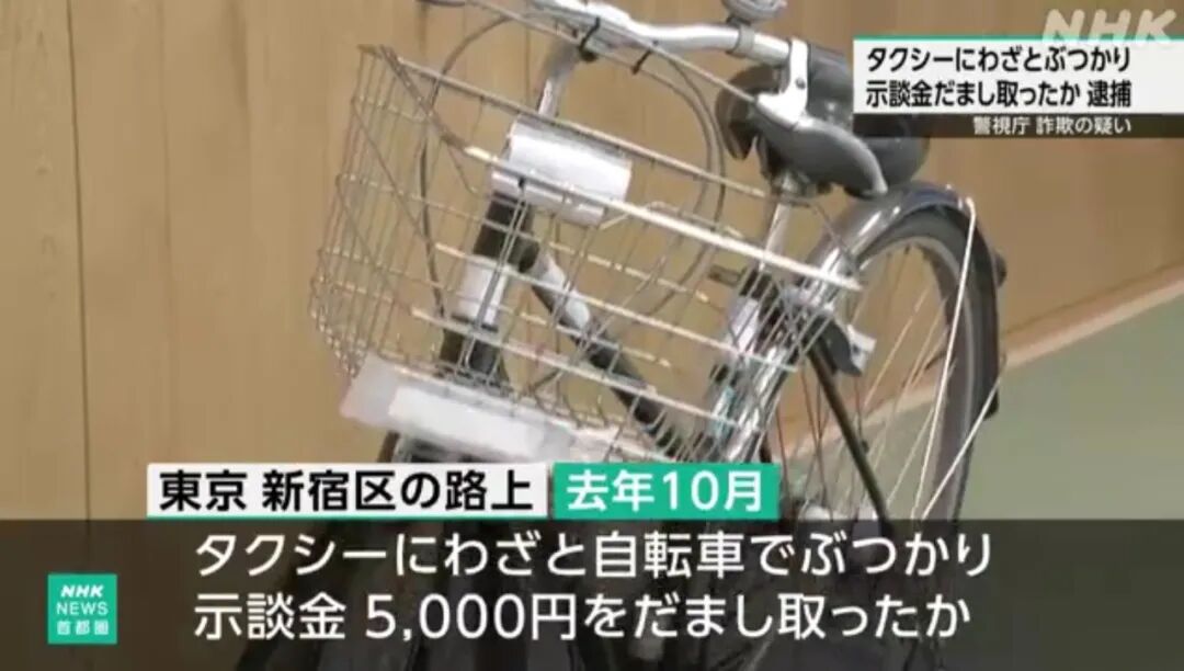 警視庁によりますと去年10月、東京 新宿区の路上で、タクシーにわざと自転車でぶつかり、示談金として5000円をだまし取ったとして詐欺の疑いが持たれています。据警视厅说,去年10月,在东京新宿区的街道上,故意用自行车撞上出租车,骗取了5000日元作为和解金,涉嫌诈骗。