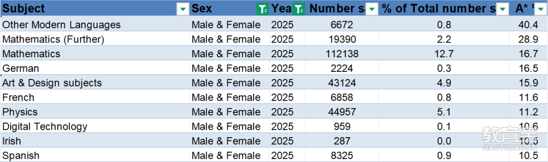 英国资格联合委员会JCQ发布了今年英国地区所有科目的报考、出分情况,来看看今年哪些科目A*率最高/最低、热门/冷门吧~A*率*高的十大科目其他现代语言是今年A*率*高的科目——高达40.4%。不过也没啥意外的,其他现代语言本来就是只有那些母语或者第二语言是某些现代语言的学生才会选的,从选课方面就筛掉了一批学生了,所以这并不代表难度低,很简单就能拿A*了。高数A*率也较高,有28.9%。但就像开头说的,这份数据仅仅指的是英国学生的*,按照往年中国学生*数据来看,中国学生的高数A*率可比这要高得多~之后七门依次是:数学-16.7德语-16.5艺术与设计-15.9法语-11.6物理-11.2数字技术-10.5西班牙语-10.5