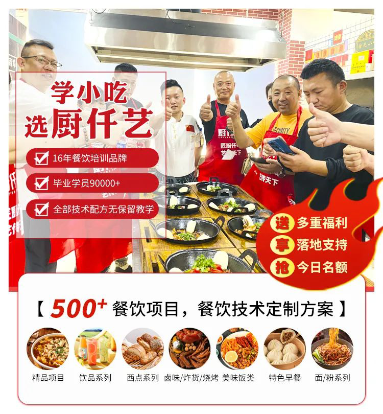 酱香饼:自带传播属性的爆款王酱料秘方:28 味香料炒制的复合酱料,咸香微辣带回甘,成本不足 0.5 元 / 份。学员实测:回头客占比超 70%,有学生连吃一周不重样。创业优势1:市场刚需强,消费场景广全时段适配:既是早餐(上班族、学生),也可搭配粥、粉延伸至午餐、下午茶,甚至夜宵,避免时段性营收断层。创业优势2:低门槛高回报,启动无压力成本极低:原料(面粉、酱料等)成本仅占售价的 20%-30%,毛利率达 60%-70%;基础设备(电饼铛、擀面杖)仅需 1000 元内即可配齐,无高额投入压力。周转快:3-5 分钟出餐,单摊位日均销量可达 200-300 份,流水轻松破 1500 元,且无库存积压风险。千层饼