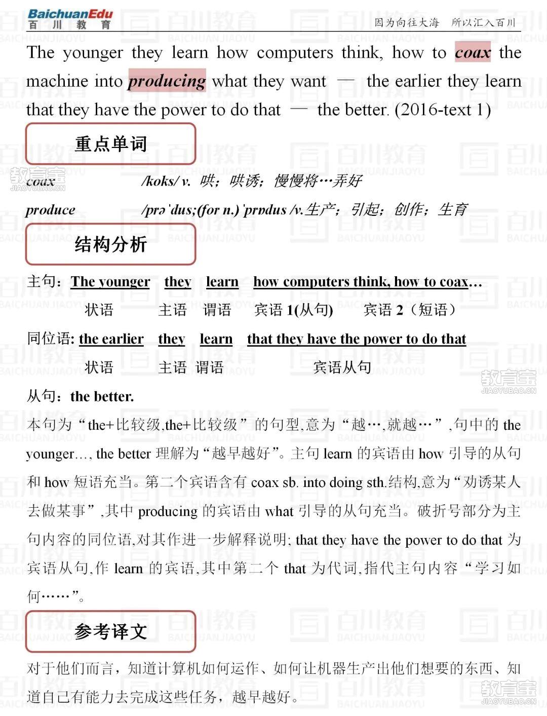 以真题为切片从今天起,百川君会每天发布一组长难句,这些均是百川英语教研组老师从考研英语二历年真题里做的切片,摘取的都是重点长难句(每篇文章摘取一句),并对其进行拆解,每个句子给出了翻译、结构分析、涉及的语法点、重点词汇和翻译点拨,由浅入深的帮大家理解真题句型,帮助同学们搞定长难句。特别说明:音频为百川英语于老师是配合图片内容进行的讲解,同学们可以边听边记哦~有任何问题都可以后台私信咨询百川老师