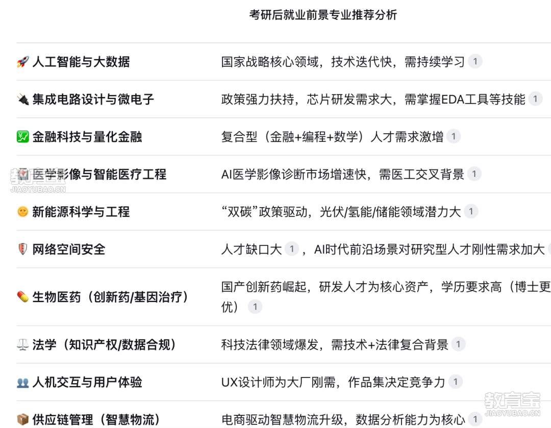 培养高水平的临床医生和医学研究者,专业性强。就业于三甲医院、私立高端医疗机构、科研单位,稳定性高,社会需求持续。??核心岗位临床医生、口腔医生、医学研究员。???院校推荐北京协和医学院:中国医学殿堂,临床医学实力无可争议的第*。北京大学医学部:与协和齐名,各专科实力均衡且强大。上海交通大学医学院(原上海第二医科大学):临床实力,附属医院资源强大。四川大学华西口腔医学院:口腔医学亚洲,被誉为中国现代口腔医学的发源地。空军军医大学(第四军医大学):口腔医学(特别是牙体牙髓病学)是国家重点。以上就是DeepSeek推荐的十大考研专业,当然,DeepSeek最后也有提到:“*好”的专业归根结底还是要选*适合你的专业。除了就业前景和薪资,在选择专业时还需要考虑:01 个人兴趣与能力匹配你是否对专业领域有真正的兴趣?你的技能和性格是否适合这个行业?例如,金融科技需要良好的数学和编程基础;人工智能领域技术迭代快,需持续学习。02 院校资源与实力学校和强校在师资、科研、校企合作、校友资源等方面能为你提供更多支持。要注意区分不同院校的研究侧重点。03 长期职业规划考虑专业的职业发展路径、晋升空间、工作强度和生活方式的可持续性。例如,生物医药领域高端岗位更青睐研究生学历,且博士学历更具优势;医学专业,特别是临床医学,考研几乎是必经之路,行业稳定性强且需求持续。但需要注意的是,涉及到选择,就会有“选择标准”,DeepSeek的选择标准并不一定适合所有人。?“热门”与“冷门”是动态变化的今天的热门专业,随着人才饱和可能不再那么紧缺;而一些当前的冷门专业,或许会因为技术突破或政策扶持成为明天的“风口”。?“高薪”往往意味着“高要求”和“高强度”高薪职位通常对技能、学历、经验有更高要求,工作压力也可能更大。?学历之外,能力更重要研究生学历是块重要的“敲门砖”,能提升起点、拓宽选择。但在实际工作中,持续学习的能力、解决问题的实力、项目经验以及专业技能证书同样甚至更为关键。希望这些信息能帮助小同学们更全面地思考,最重要的是结合自身情况,做出适合自己的选择。??「常驻福利-NO.1」ヽ(??▽?)ノ