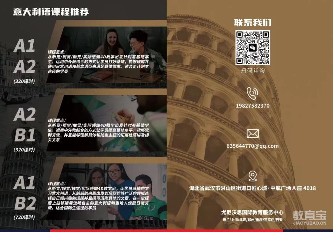 意大利语培训10-A2课程(320课时)( 马可波罗、图兰朵计划生)课程简介:针对零基础意大利水平的学生,会中文的意大利外教带领学生轻松入门意大利语,学完达到欧标A1等级,能够理解并使用日常用语和基本句型来满足具体的需求,能够进行自我介绍或介绍他人,能够提问并回答,如个人信息、亲属关系、住所、籍贯、朋友,问候问路购物等,能够在提问人语速较慢的情况下加入对话。适合对象:兴趣爱好者 零基础需要 旅游需要 留学入门语言需要,针对需要达到A1考试标准的学生、日常用语交流的人群教材:由尤尼沃思米兰总校多名外教找到*适合中国学生的教材espresso配合内部教材。课程及师资优势:1:根据每位学生个人时间合理定制上课时间,保证每人时间充分利用。2,全外教5到8人小班授课,让每位学生都能迅速融入课程。3,每班一名中文助教教,负责外教和学生之间的课程记录和跟踪。4,意大利特派资深外教,有相关教学资格证,所有助教均为意大利留学归来的留学生。课时分配:《320课时》20-B2课程(720课时)(国际生) 课程介绍:零基础开始教学,循序渐进系统学习意大利语语音、及全部常用语法, 培养意大利语听说读写四大技能,学完达到欧洲标准B2水平,满足意大利大学国际生入学要求与签证要求。能与意大利人无障碍沟通, 能用意大利语准确表达个人观点,讨论热点话题,理解复杂的书面语言,看懂抽象的文章, 书写记叙、论述、说明等多种题材的文字或商业信件等,达到4000-4500个左右的单词量。后期,重点提高您听说能力, 进行签证模拟,帮助您顺利通过面签.适合对象:国际生留学需求,商务外派工作需求,B2官方语言等级考试需求教材:由尤尼沃思米兰总校多名外教找到*适合中国学生的教材espresso配合内部教材。课程及师资优势:1:免费测试,为学员量身定制个性化学习方案及课程规划2,全外教5到8人小班授课,提高教师在教学过程中对每个学生的关注度。3,边学边练习,情景模拟,让您在轻松的教学中学会意大利语。4,每班一名中文助教教,负责外教和学生之间的课程记录和跟踪。5,意大利特派资深外教,有相关教学资格证,所有助教均为意大利留学归来的留学生。课时:720课时尤尼沃思