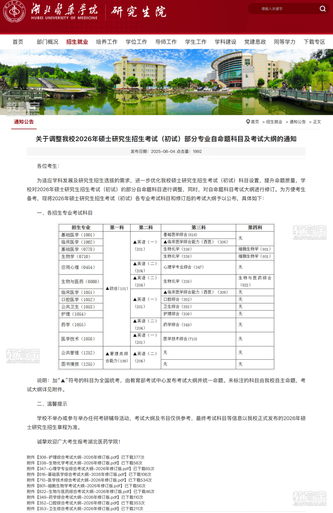 https://yjs.gnnu.edu.cn/info/1025/11781.htm?? 湖北医学院 湖北医学院发布了关于调整我校2026年硕?研究?招?考试(初试)部分专业?命题科?及考试?纲的通知。