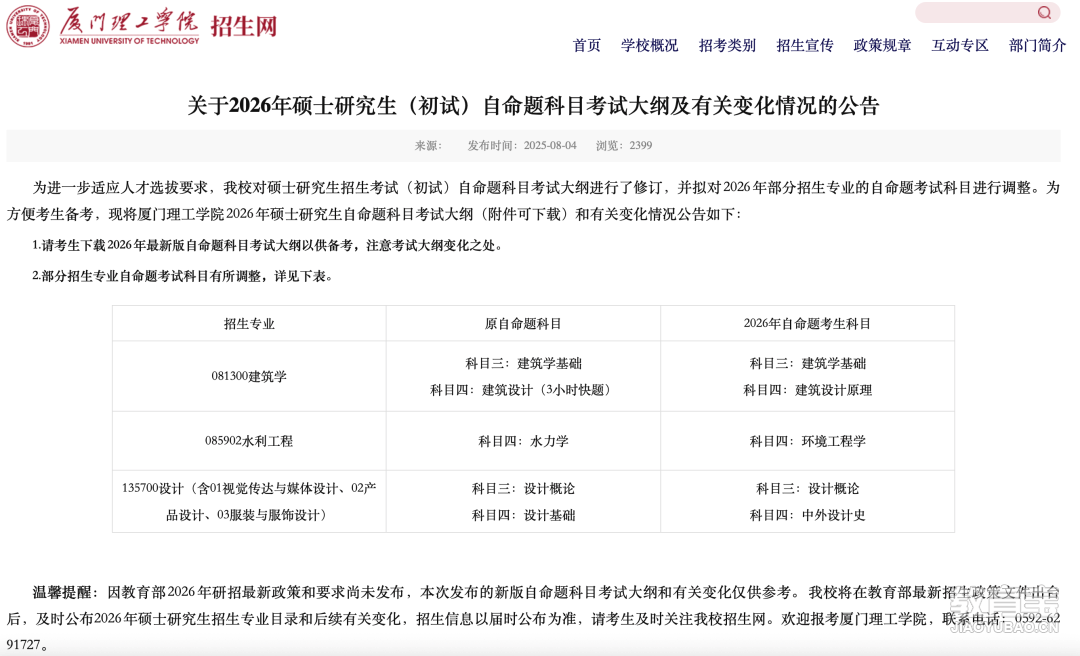https://yjs.cueb.edu.cn/zsks/zsdt/ad72cab55b1847b2b6cbcde7a2400f3e.htm?? 厦门理工学院 厦门理工学院发布了关于2026年硕士研究生(初试)自命题科目考试大纲及有关变化情况的公告。
