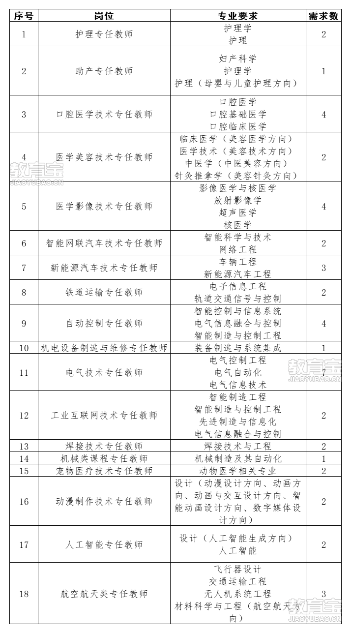 一、学校概况德州科技职业学院是由山东省政府批准、国家教育部备案的全日制普通高等院校,也是德州市高职院校。办学37年来,学校坚持正确的办学方向,深化教育教学改革,深入推进校企合作,累计向社会输送各类技能型应用、管理人才达20余万人,得到了社会各界的普遍认可与高度评价。 学校建有德州校区和禹城校区,校园占地2260亩,建筑面积80万平方米,现有在校生1.7万余人,教研设备总值1.15亿元,馆藏纸质图书160万余册。学校积极融入京津冀协同发展,对接区域主导产业和战略新兴产业。学校设智能制造学院、航空学院、交通学院、信息工程学院、数字经济学院、医学护理学院、教育与艺术学院、继续教育学院、马克思主义学院、乡村振兴学院等10个二级学院,开设有58个专科专业,面向全国招生。 学校实施“专家治校、教授治学、人才强校"战略,先后派出百余名教师到国内外知名高校和科研院所进修,到对口企业挂职锻炼,并多次选派骨干教师到德国、澳大利亚、新加坡等国家深造。学校坚持立德树人为先,践行“1+3+N”人才培养模式,把产业链、专业链、人才链、创新链相衔接,培养学生专业技能和创新就业能力,在教学过程中,线上线下相结合,采用项目化、案例式、模块化等教学方法,并充分发挥第二课堂的作用,促进学生全方位综合发展,连续五年实现就业满意率高。 学校以师德建设为重点,强化师资队伍建设,积极引进高层次、高技能专业人才,打造有理想信念、有道德情操、有扎实学识、有仁爱之心的“双师型” 教师队伍。建有省级黄大年式教师团队、教学团队、教学创新团队等6个,产教融合型试点专业1个、省级产教融合示范性品牌专业、示范专业、特色专业、企校共建专业10个,省级品牌专业群1个,立项省级高水平专业群2个,省级以上精品课程32门。近三年学校承担国家、省、市科研项目500余项,获国家专利650余项,先后获得山东省教学管理先进集体、山东省职业教育就业先进单位、山东*具特色的高职教育品牌院校等荣誉称号。 二、招聘要求 1.具有中华人民共和国国籍、热爱祖国,具有良好的思想政治素质和政治理论水平,拥护党的路线方针政策,遵纪守法品行端正,无任何处分,热爱教育事业,有较强的敬业精神和管理教科研能力; 2.热爱教育事业,认同学校办学理念,身心健康,综合素质全面,组织观念和责任心强,有吃苦耐劳和团队协作精神; 3.符合岗位要求的工作能力; 4.学历要求:硕士研究生及以上学历(有相关工作经历或有相关技能证书或具有相关参赛经历并获奖者,学历可适当放宽)。 三、招聘岗位