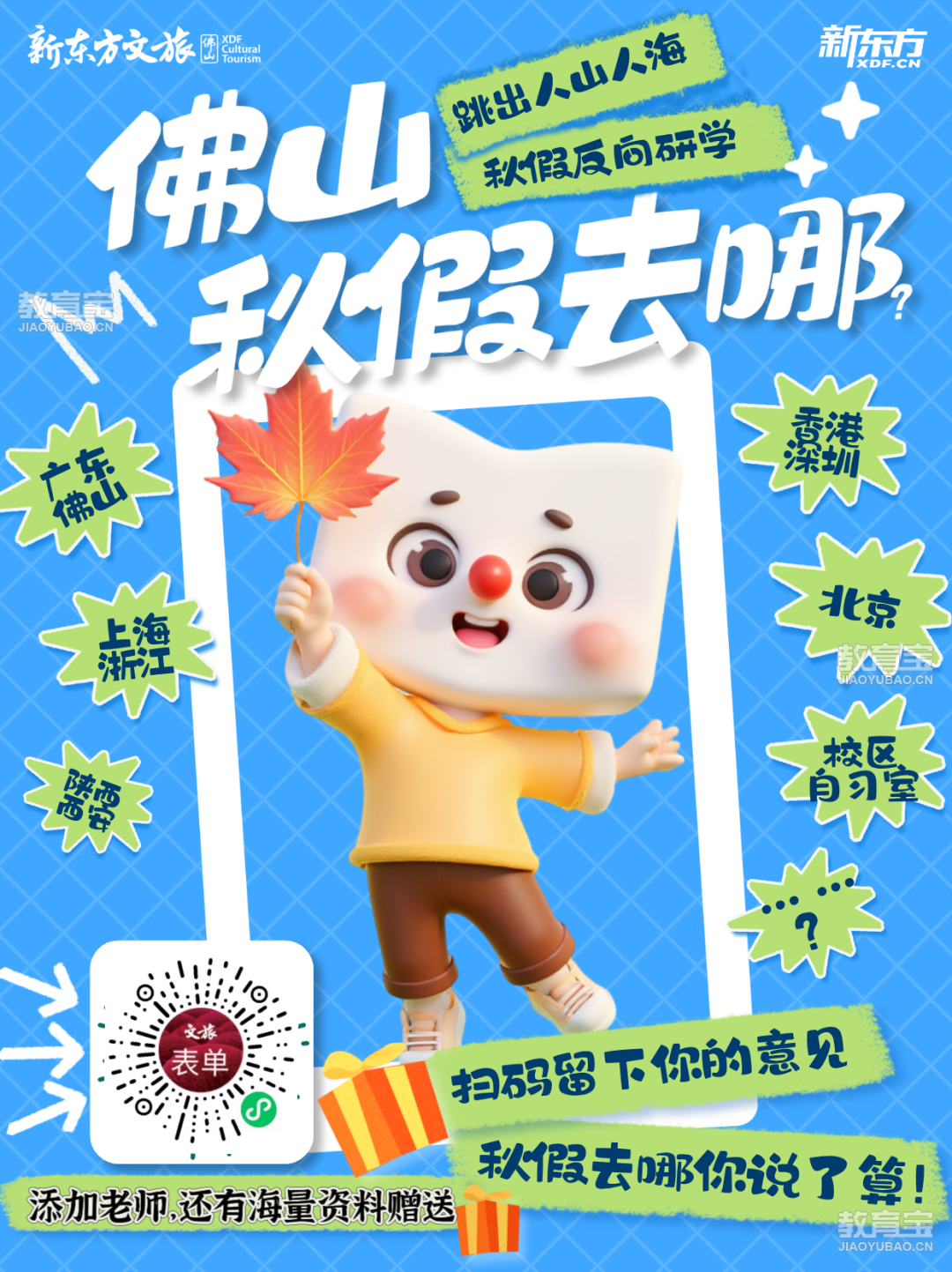 安全保障AUTUMN新东方文旅细节把控:- 师生配比1:5,安全又贴心- 每天直播娃的活动瞬间,家长远程围观不焦虑- 结营送专属研学手册,娃的秋假成果一目了然