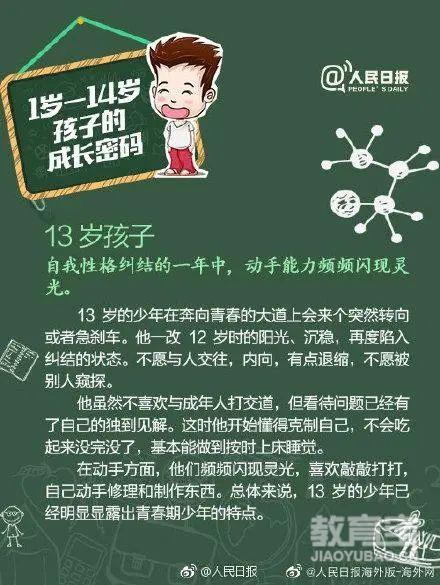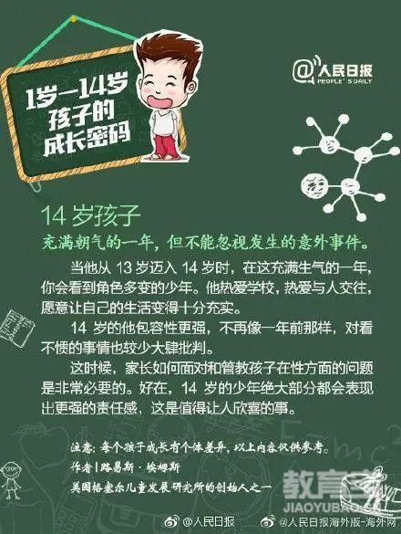 14岁的孩子包容性更强,不再像一年前那样,对看不惯的事情也较少大肆批判。这时候,家长需要面对和管教孩子在性方面的问题。养育孩子是父母的必修之路,更了解孩子,才能更好地成为他的人生引导者。声明:本文图片素材来源于“人民日报”官方微博,版权归原作者所有,如涉及版权请联系我们删除。--END--家庭教育对孩子的人生具有深远的影响,它不仅是孩子成长的基石,还将伴随孩子的一生,良好的家庭教育会对孩子产生非常积极的影响。要想正确的教育孩子,一定要有正确的养育观念,再结合正确的教育方法。版权声明:本公众号赞成并遵循微信公众平台关于保护原创的各项举措。本号文章与素材仅做公益性分享,部分推送文章、图片可能未能事先与原作者取得联系,或无法查证真实原作者,若涉及版权问题,请原作者与我们联系。经核实后,我们会及时删除或者注明原作者及出处。谢谢。