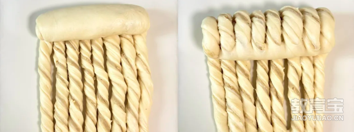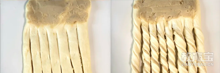 顶部抹50克栗子馅 面团下半部分切成8条拿起面团扭成麻花