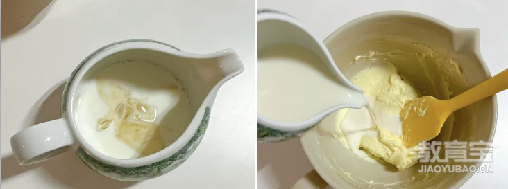 泡软的吉利丁?热牛奶搅拌融化,倒入奶油奶酪里搅拌均匀