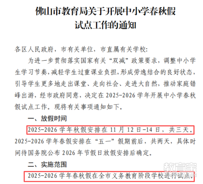 佛山市不少学校已开始通知秋假安排,消息一出,家长圈瞬间炸锅!你支持放春秋假吗? 欢迎下方投票! 佛山中小学放秋假,被家长投诉此前,佛山市教育局印发《佛山市教育局关于开展中小学春秋假试点工作的通知》。《通知》指出,为进一步贯彻落实国家有关“双减”政策要求,调整中小学生学习节奏,减轻学生过重课业负担,形成劳逸结合的良好状态,引导学生更多地走出课堂、走向社会、走进大自然,2025-2026学年将在全市义务教育阶段学校进行春秋假试点。