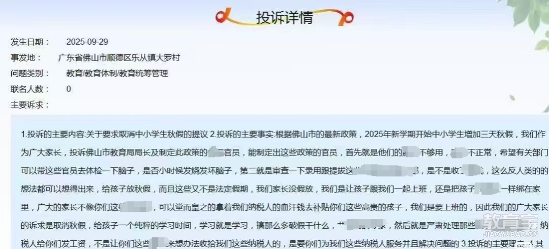 △佛山某学校放秋假通知消息一出,家长圈瞬间炸锅了!一位家长写了几百字的长文投诉,建议取消中小学生秋假,原因是打工人要上班,根本没人带娃!