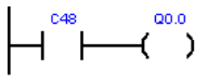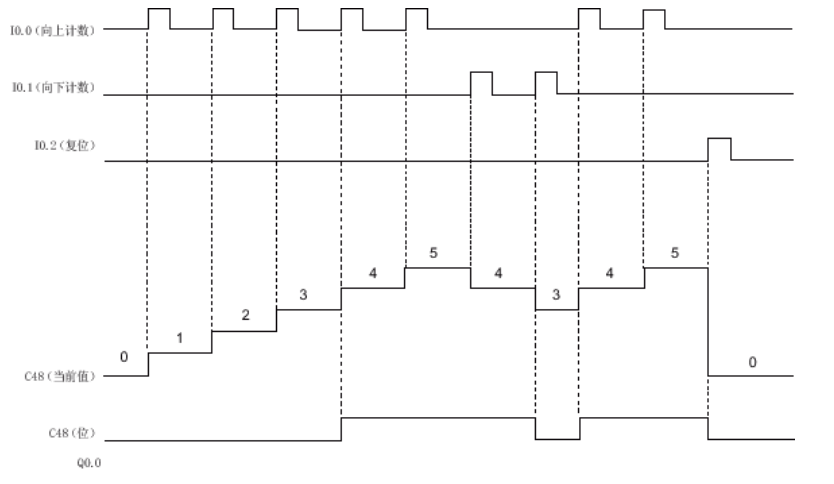 逻辑功能:当前值≥4时,C48位接通(Q0.0输出高电平)。复位信号(I0.2)强制当前值归零,C48位关断。时序特性