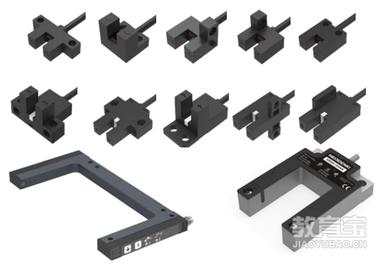 五、槽型光电开关槽型光电开关从外形来看,有很多种类型,我们根据结构的不同来选择,使安装固定更加方便。槽型光电开关通常用于旋转运动直线运动的极限位置,丝杠,齿条、同步带的原点或限位较多。