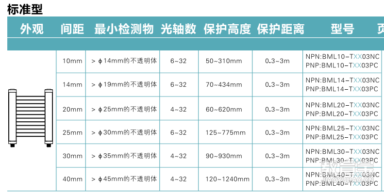 八、安全光栅安全光栅,也叫安全光幕,它是一种光电安全保护装置,主要是避免设备在运行过程中人员与设备接触发生事故。我们在选择安全光栅的时候,首先需要根据保护的对象来选择间距,比如要求手指不能进入时,间距要选小的,再来还需要确定它的保护高度和距离。