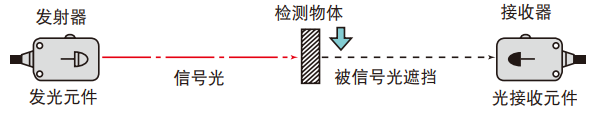 三、对射式光电开关对射式光电开关,发光元件和光接收元件是分开的,安装的时候需要进行调节,使它们两个的光束同轴,当目标物遮断发射器和接收器间的光轴时进行检测。优点:检测距离长、对检测物体的限制少,稳定的检测状态,可以检测不透明的目标物,无论其外形、颜色或材料如何。