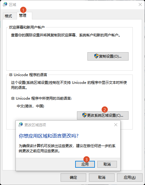 ?? STEP 3:关键系统设置进入【管理】选项卡 → 点击【更改系统区域设置】→ 应用
