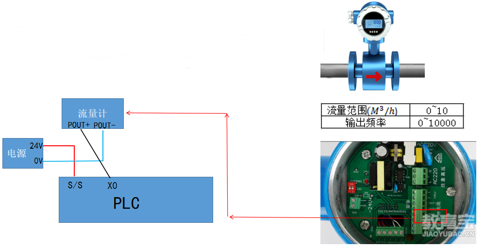 PLC公共端接入正24V,因此X点接收端的信号应为负,所以把负电压接入流量计负端,流量计正端信号接到X0即可。