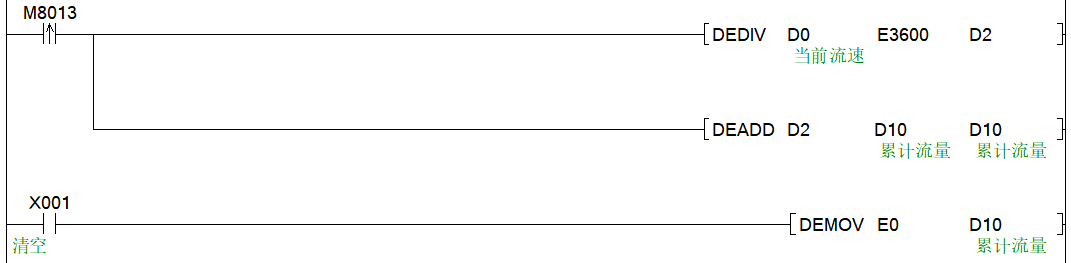 M8013每隔1s导通1次,做个加法累加一次,得到的就是总流量,上面求出的值的单位需要转换为秒,因此需要除以3600s,得出的才是实际的流速,保存在D2,然后用加法指令去累加,得到的就是累计流量。另外设置了一个清空按钮X1,按下即可清空累计流量。